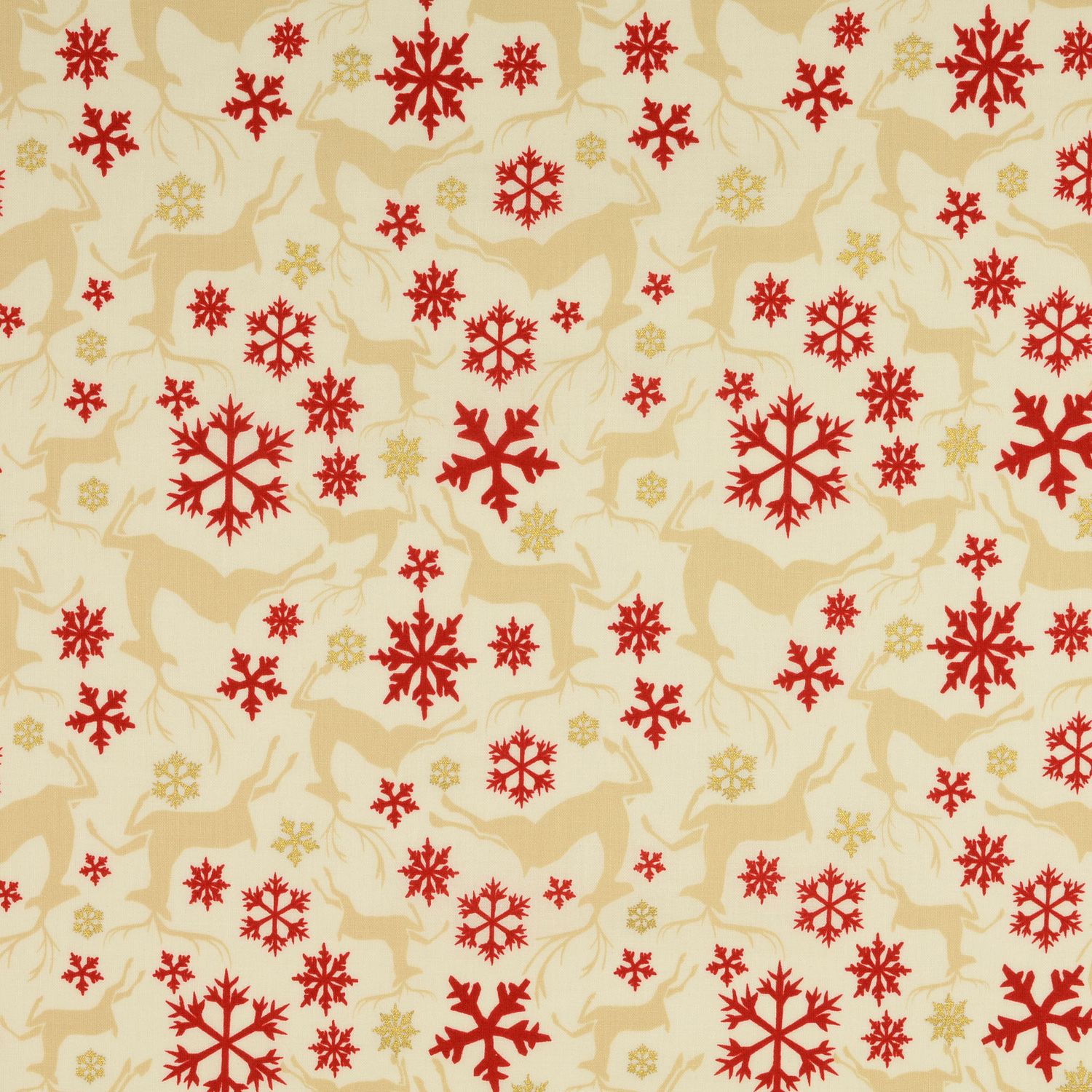 Algodón con estampado dorado Navidad Ciervos saltarines y copos de nieve sobre crema