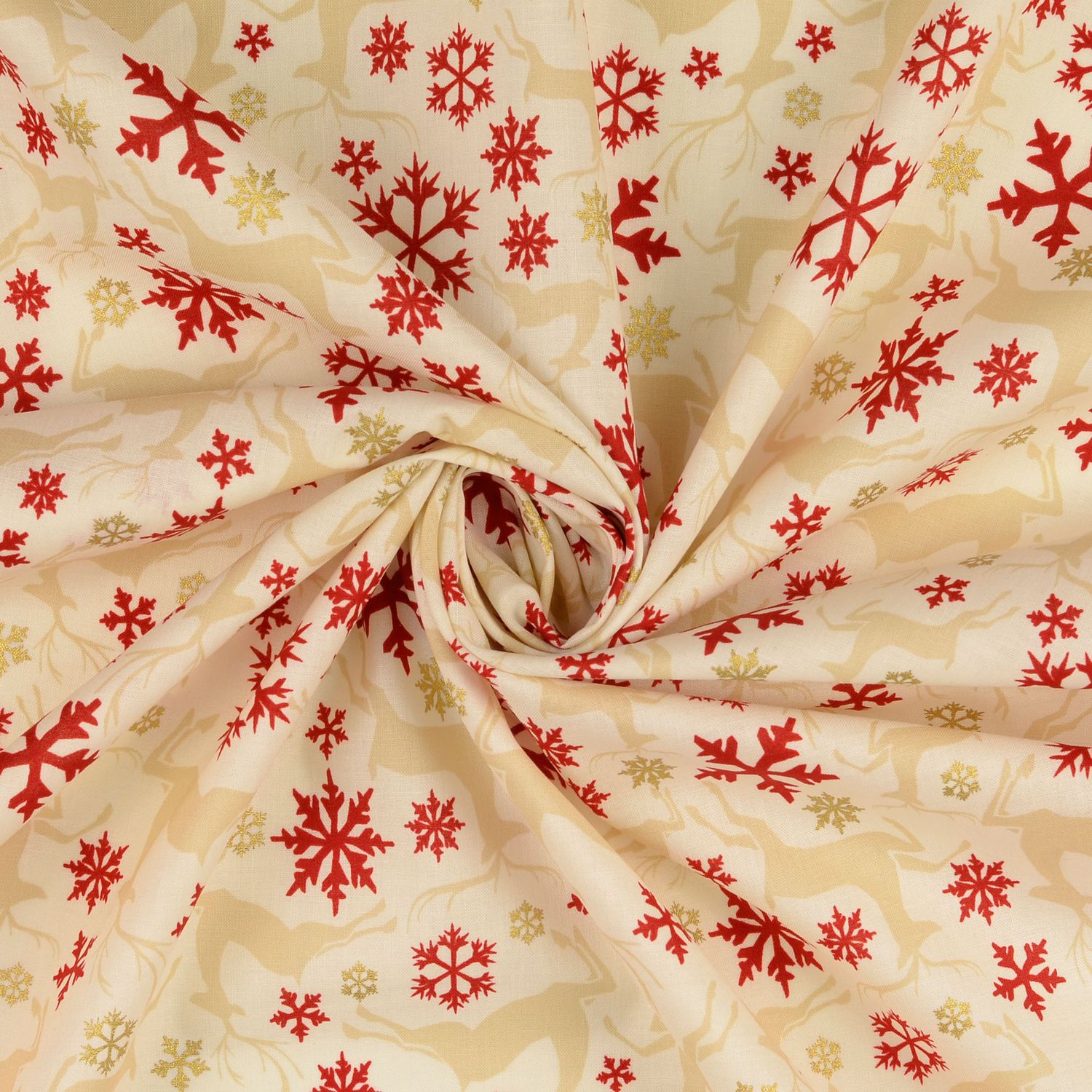 Los ciervos saltarines parecen vivos y juguetones, mientras que los delicados copos de nieve dorados están esparcidos como cristalitos de hielo relucientes sobre la tela. Así se crea una armoniosa combinación de naturaleza, magia invernal y elegancia festiva – ideal para quienes prefieren una Navidad con estilo.