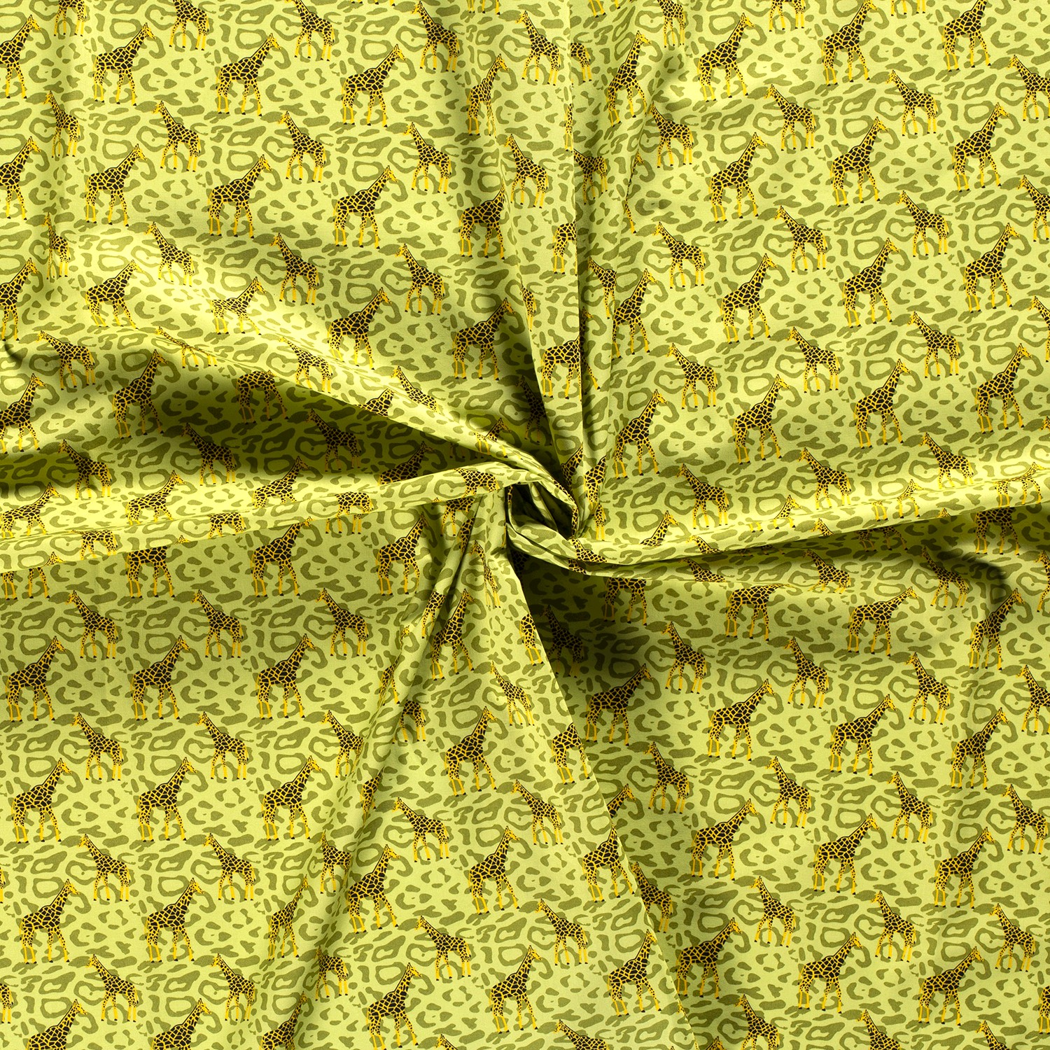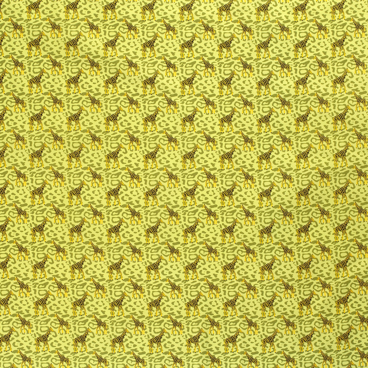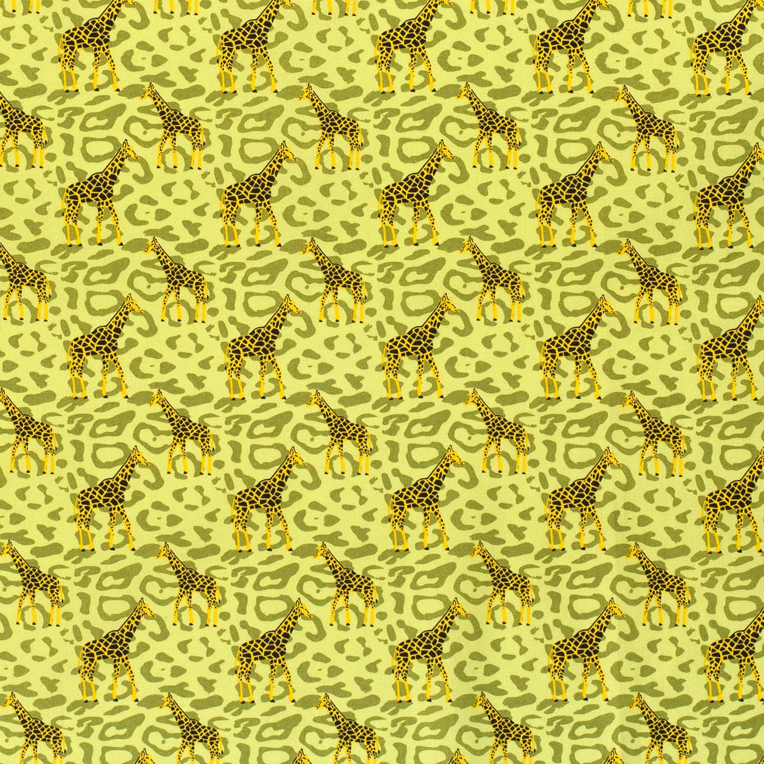 Una tela que es un estimulante del buen ánimo: sobre un fondo verde lima brillante se encuentra el salvaje estampado de leopardo con adorables jirafas estilizadas – una mezcla alegre de ambiente safari y diseño animal de moda. Las jirafas en tonos cálidos amarillos y marrones destacan juguetonamente sobre el patrón de leopardo contrastante, haciendo de la tela un verdadero atractivo.