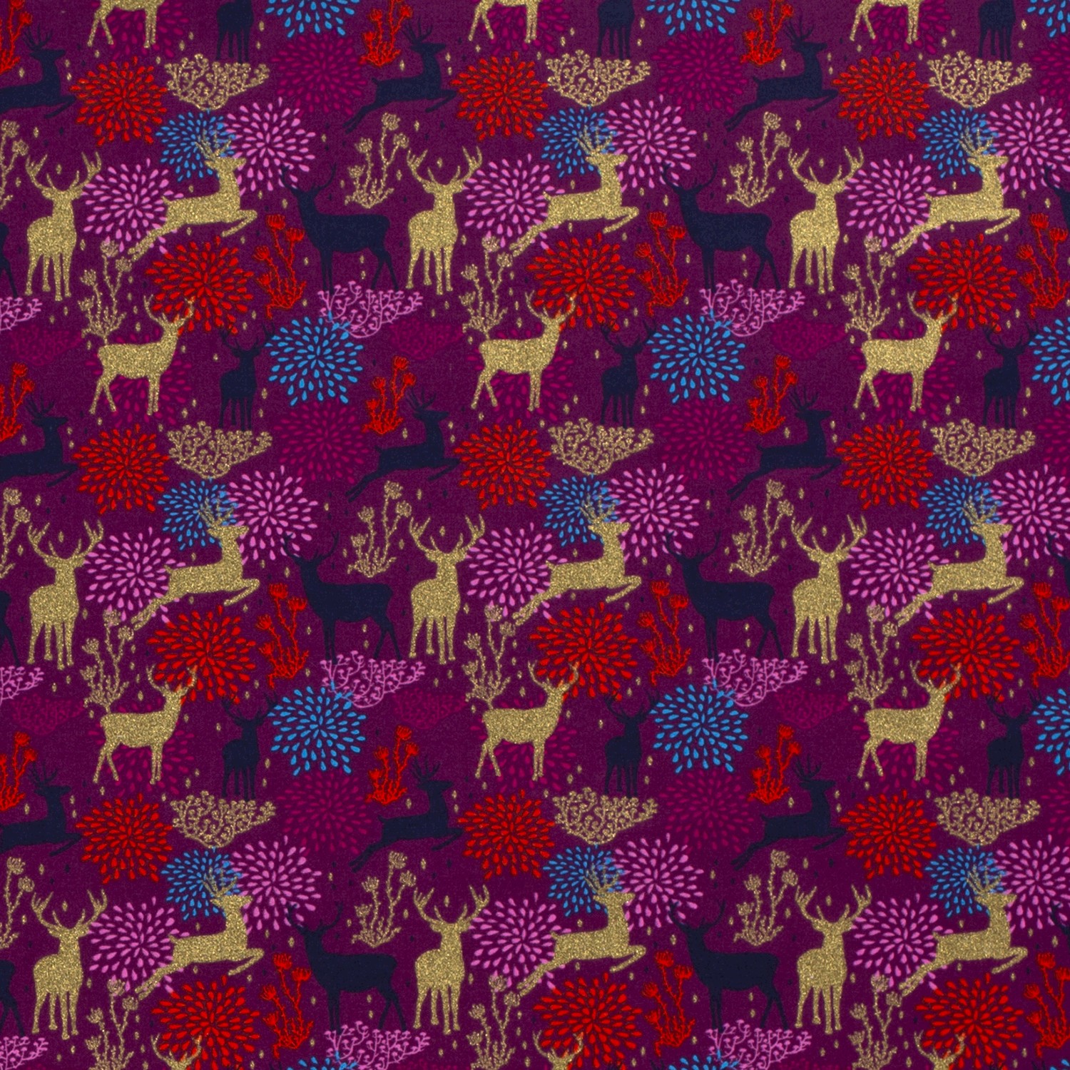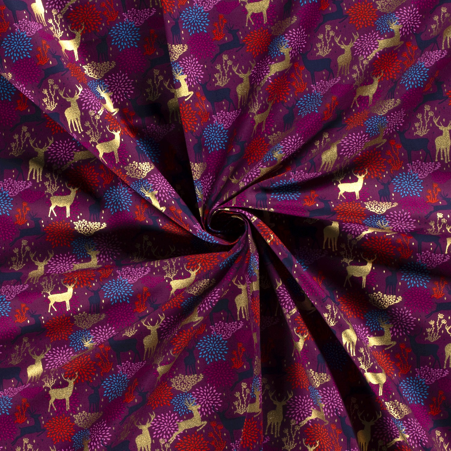 Algodón NAVIDAD Estampado en foil Ciervos y hierbas en fucsia