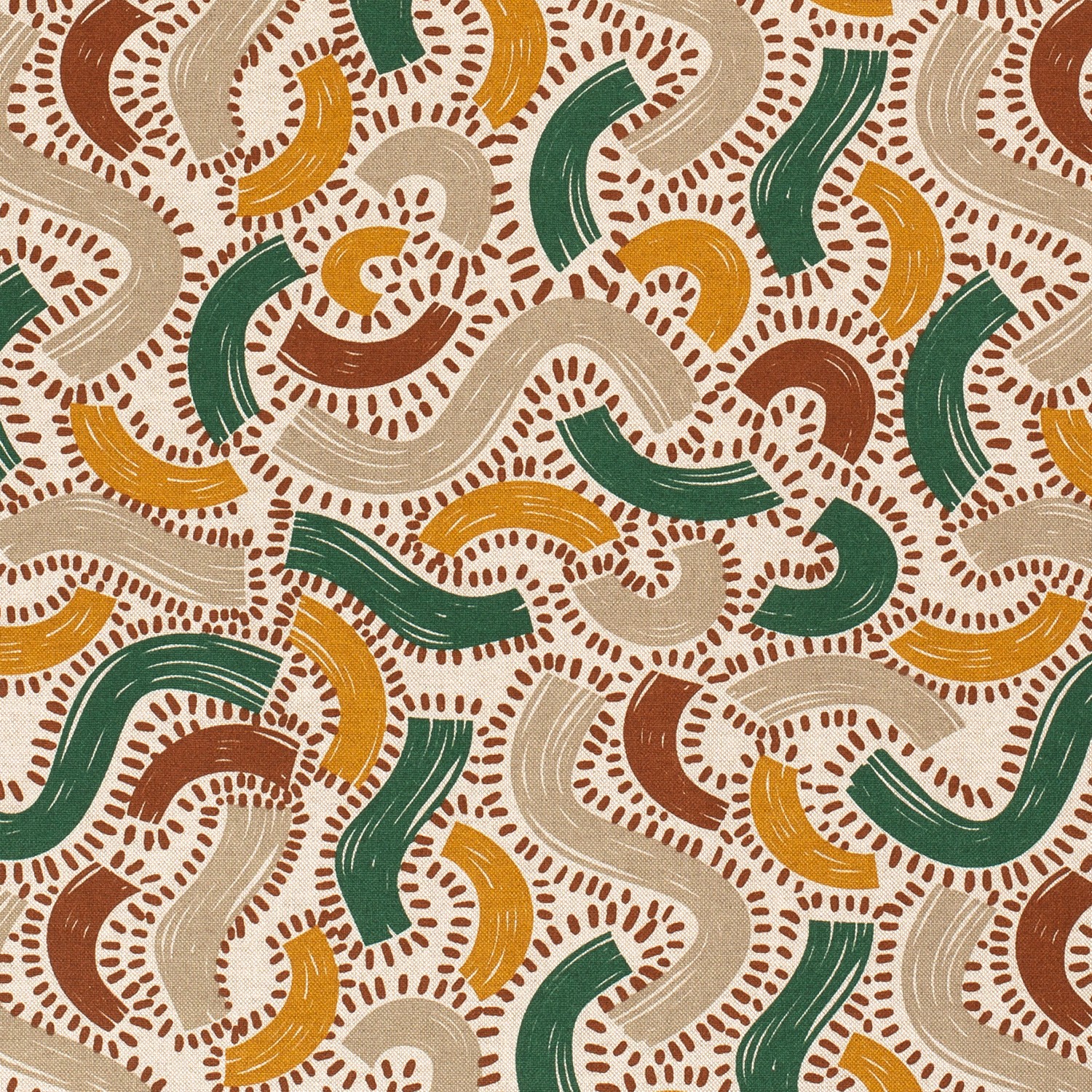 Este canvas con el moderno look de lino aporta inmediatamente un encanto retro a tus proyectos de costura. Sobre un tono beige cálido, bailan finas líneas irregulares y arcos fluidos en suaves tonos naturales y tierra – un patrón gráfico que recuerda a bocetos hechos a mano y que resulta a la vez moderno y atemporal.