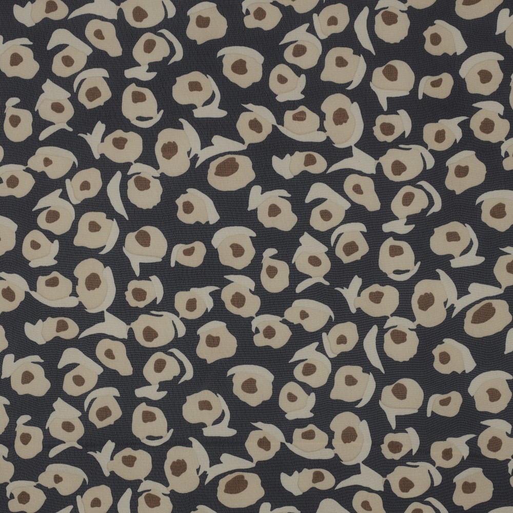 Delicado chifón con aspecto artístico: sobre un fondo azul marino profundo se despliega un mar de flores abstractas en suaves tonos arena y crema, acentuado por finas y oscuras líneas. Las formas florales parecen pintadas – a veces con transiciones suaves, otras claramente definidas – lo que confiere a la tela una elegancia y ligereza casi etérea.