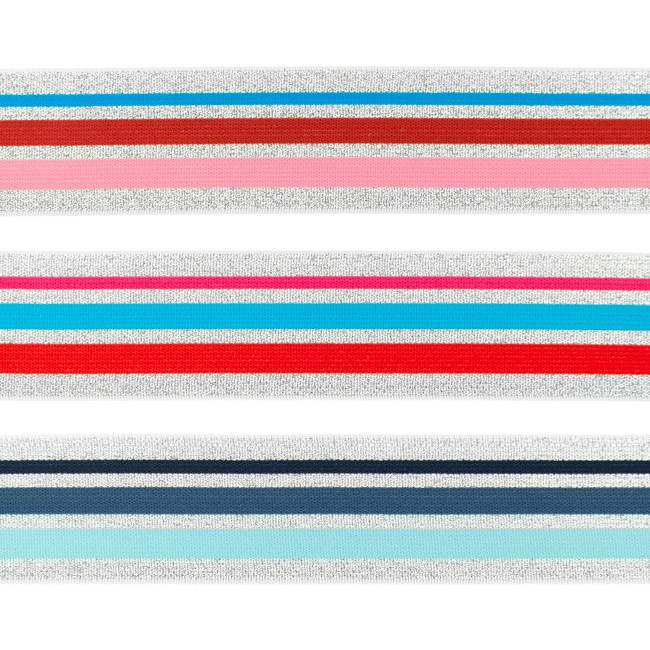 Esta cinta elástica brillante con rayas de lúrex plateado convierte cualquier proyecto de costura en una atracción. Los finos y relucientes hilos plateados metálicos recorren los bordes como un elegante marco y permiten que brillen las rayas de colores intermedias.