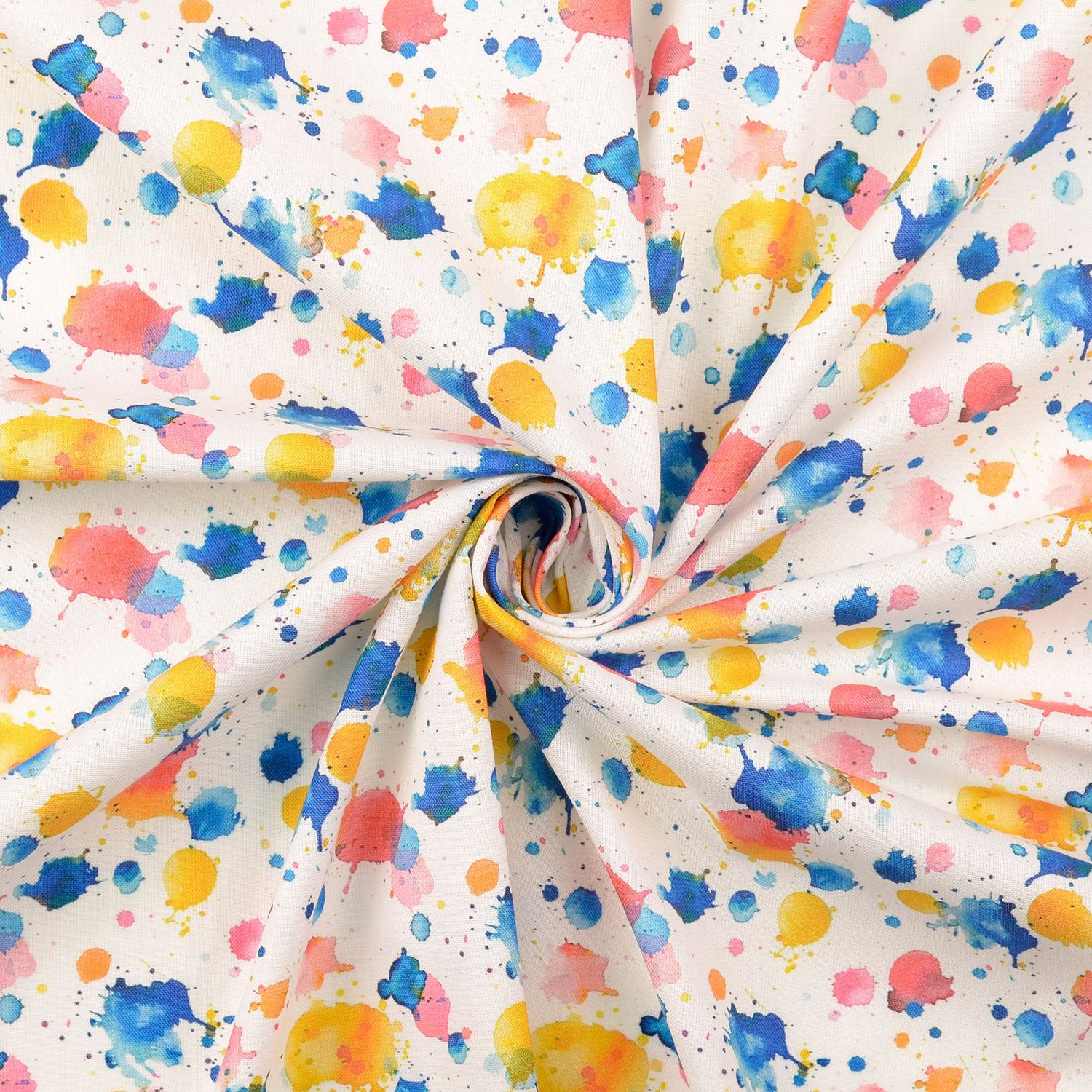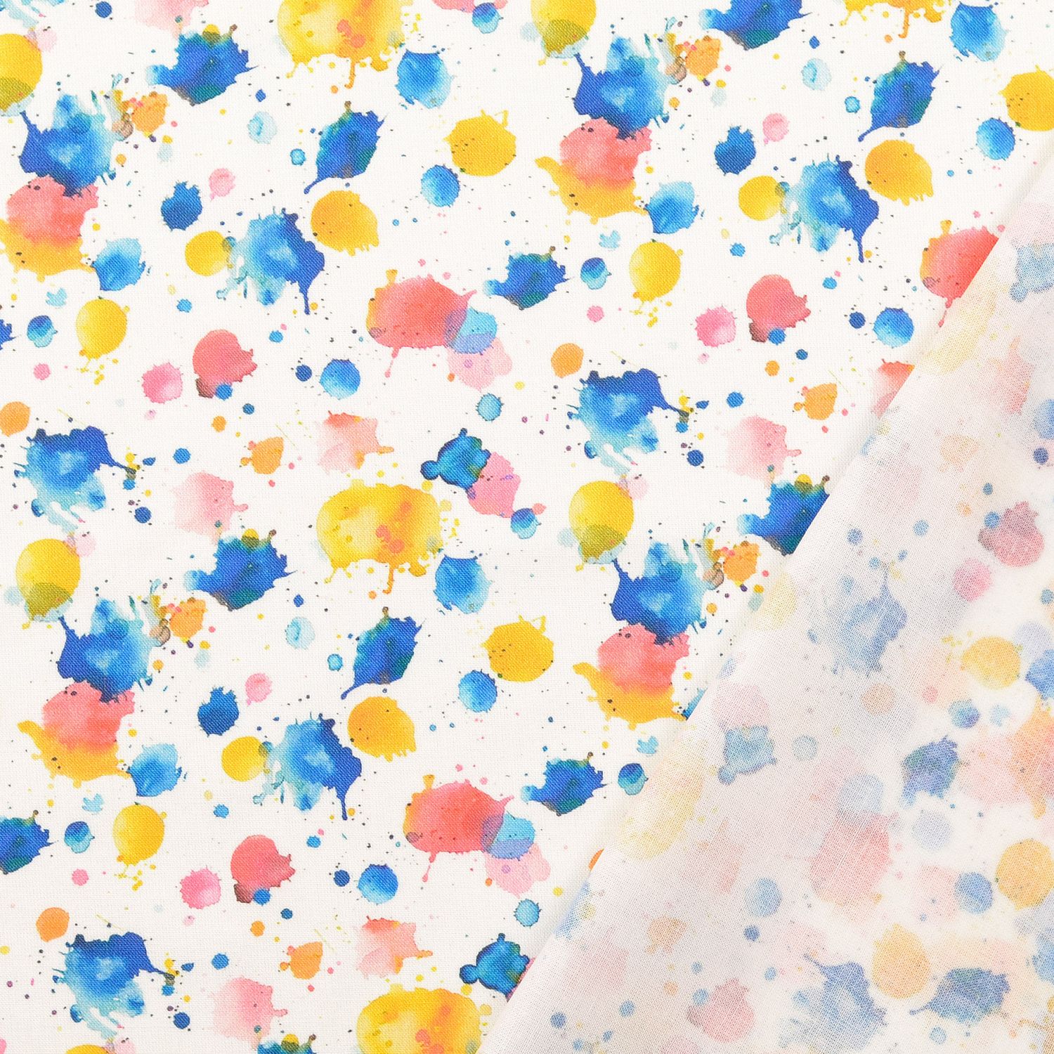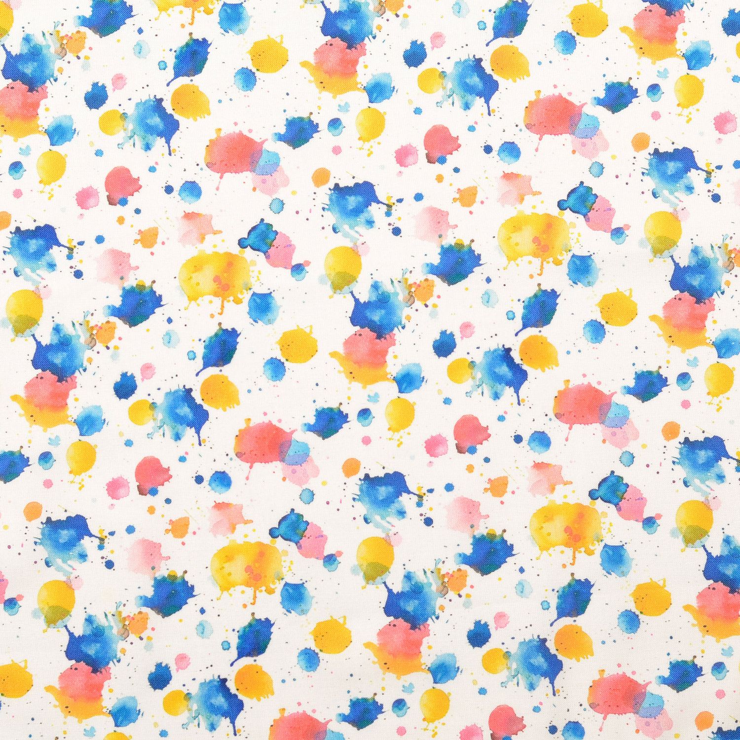 Una tela como una paleta de colores burbujeante: Sobre un fondo blanco brillante se encuentran salpicaduras de colores en tonos vivos – desde rojo intenso y rosa hasta amarillo soleado, azul fresco y verde tranquilizador. Las manchas vibrantes parecen aplicadas con pincel y dan al diseño una apariencia alegre y creativa.