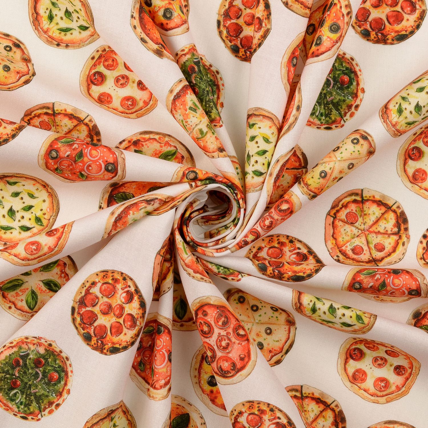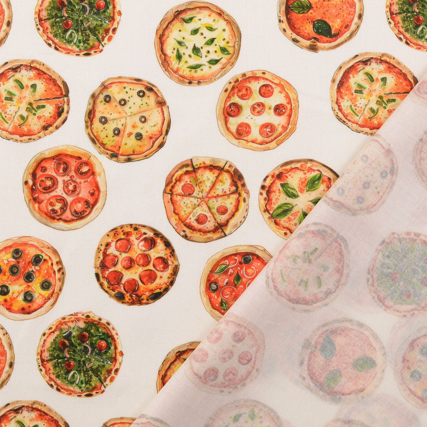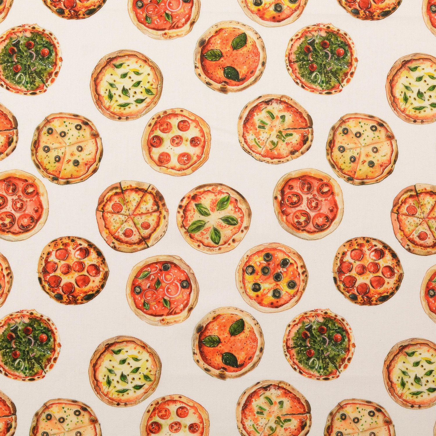 ¡Esta tela es una auténtica delicia para todos los amantes de la pizza! Sobre un fondo blanco brillante, se despliegan piezas de pizza impresas con detalle en apetitosos tonos amarillos, rojos y marrones – desde queso dorado hasta jugosas rodajas de tomate y sabrosos ingredientes. Pequeños detalles cuidadosamente diseñados hacen que los motivos parezcan recién salidos del horno y aportan un aspecto alegre y juguetón.