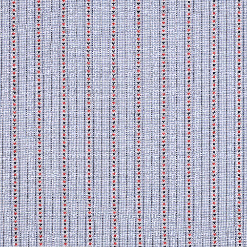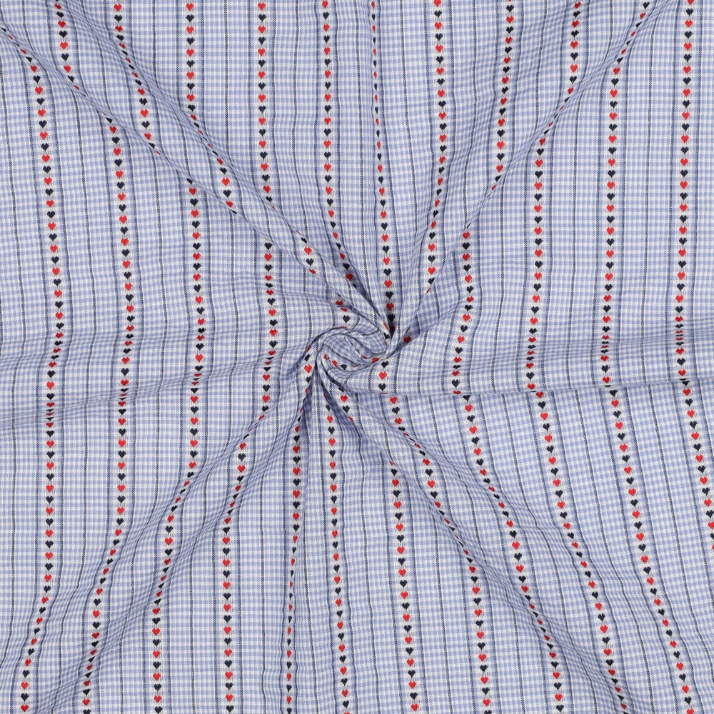Una tela para enamorarse: este delicado diseño jacquard azul claro combina un clásico patrón de cuadros con pequeños corazones tejidos con cariño. La fina estructura le da a la tela un aspecto elegante y ligeramente plástico, donde el patrón brilla discretamente según la incidencia de la luz.