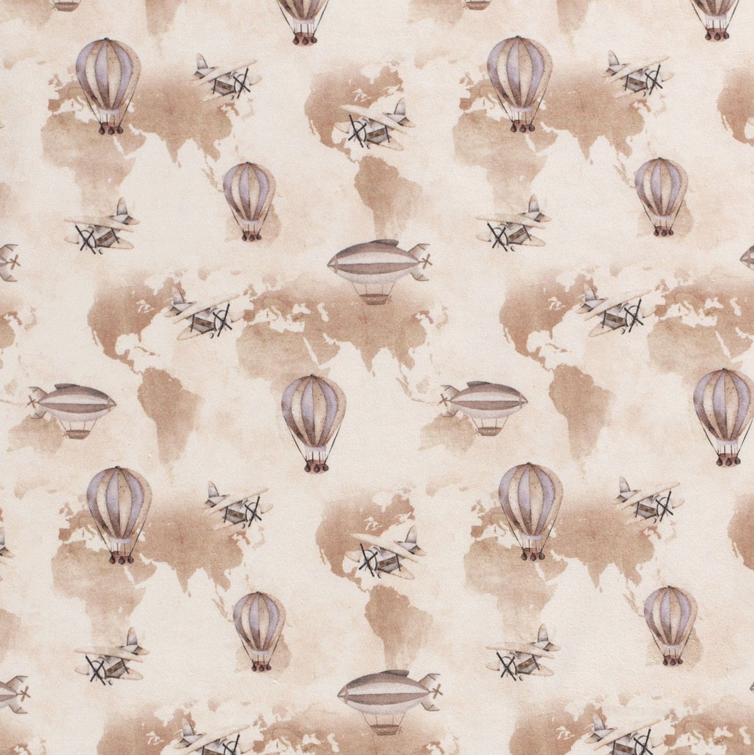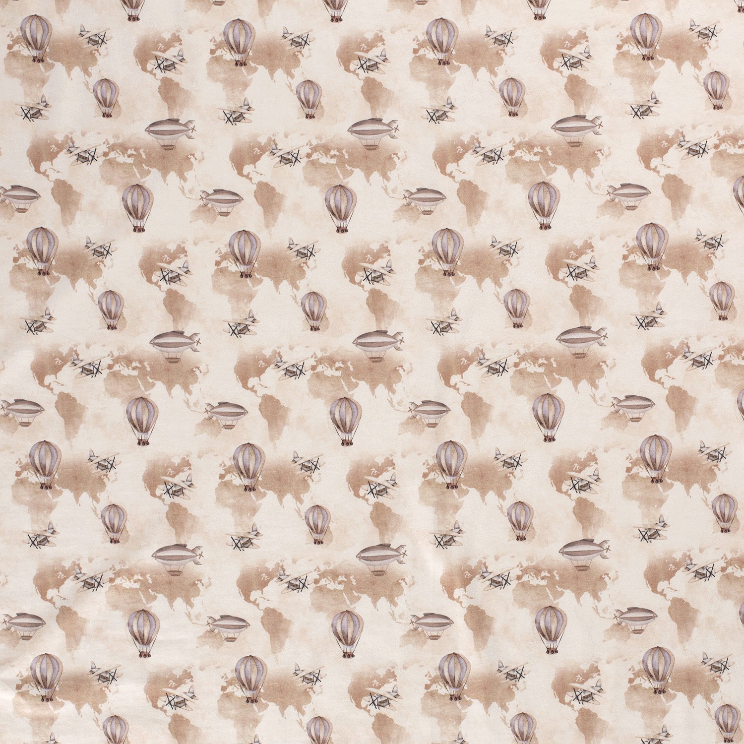 Un cielo lleno de aventuras: Sobre un fondo crema flotan aviones nostálgicos, biplanos, dirigibles y coloridos globos aerostáticos entre suaves nubecillas blancas. Los aparatos voladores cuidadosamente diseñados en delicados tonos azul, rojo, amarillo y gris parecen sacados de un cuento ilustrado e invitan directamente a soñar.