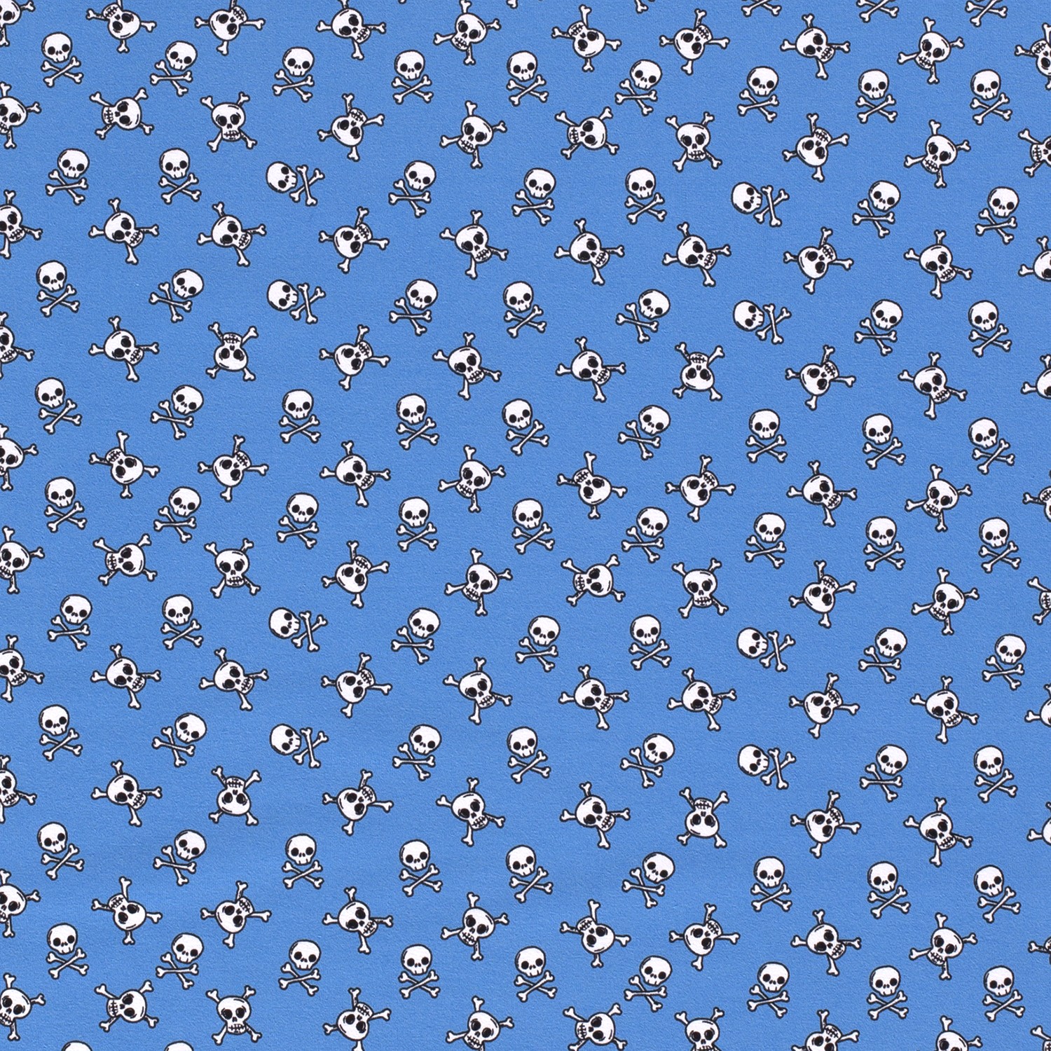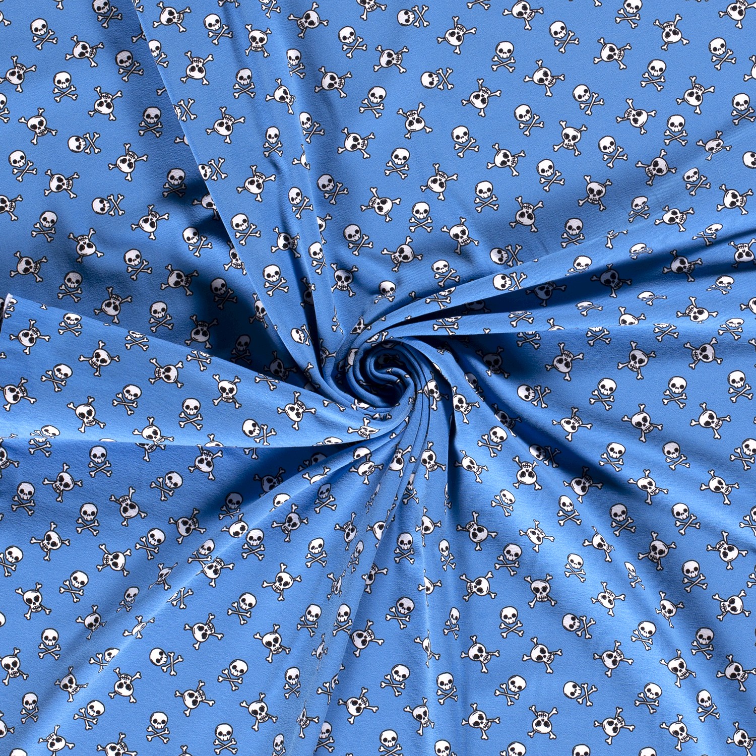 Este jersey lleva el estilo pirata marítimo directamente a tu mesa de costura: sobre un suave fondo celeste, pequeñas calaveras blancas y huesos cruzados se despliegan — atrevido, pero adecuado para niños y juguetón. El diseño claro y contrastante se ve moderno y a la vez maravillosamente desenfadado.