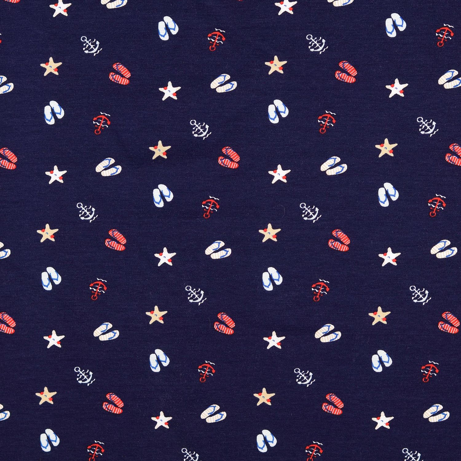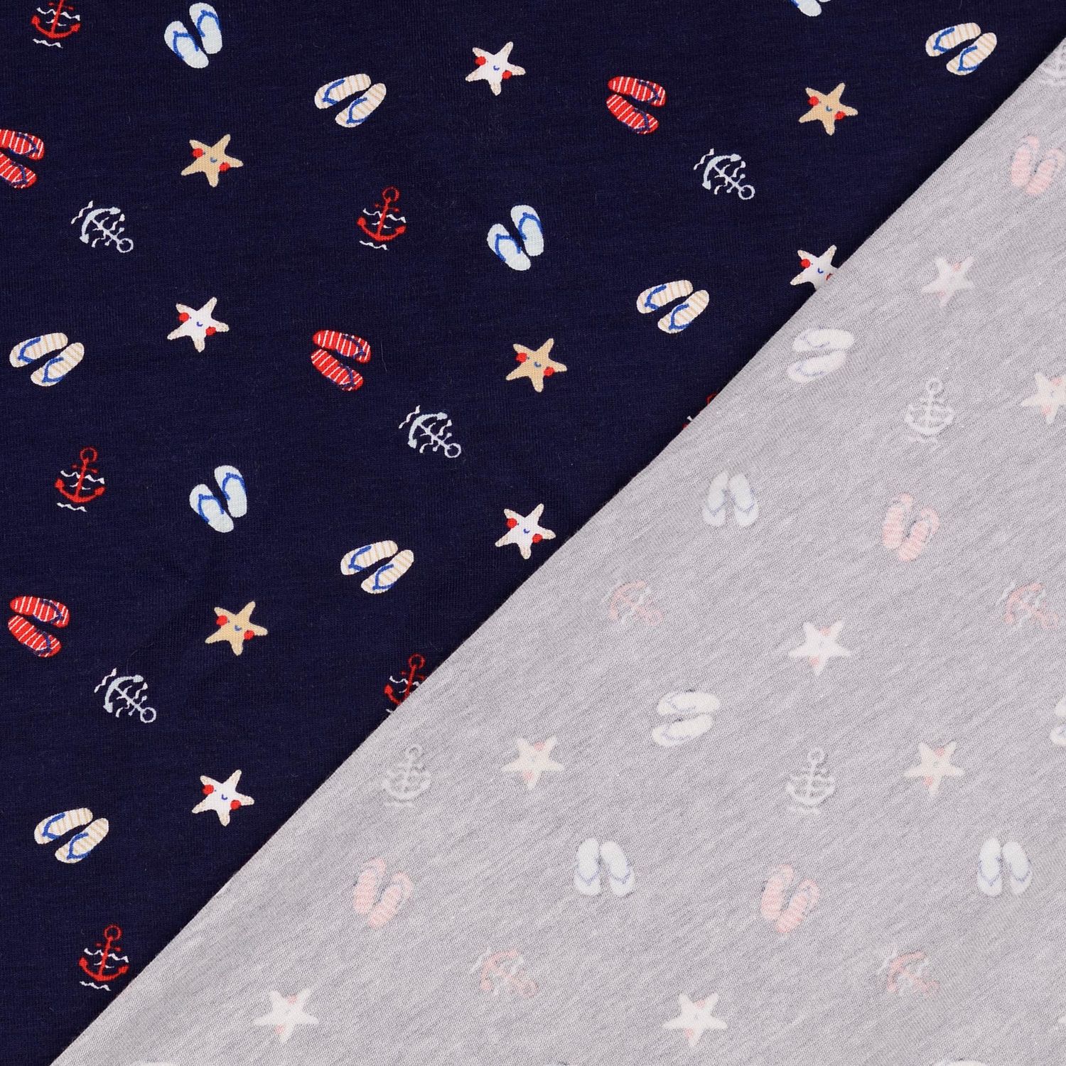 ¡Sensación pura de verano! En este alegre jersey se despliegan coloridas chanclas en distintos colores y patrones sobre un fondo azul brillante, como un paseo por el paseo marítimo. Las pequeñas chanclas están diseñadas con cariño, a rayas, a lunares o muy sencillas, y aportan inmediatamente un aire vacacional a cualquier proyecto de costura.