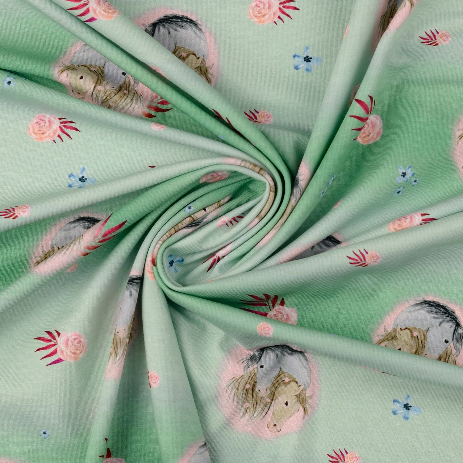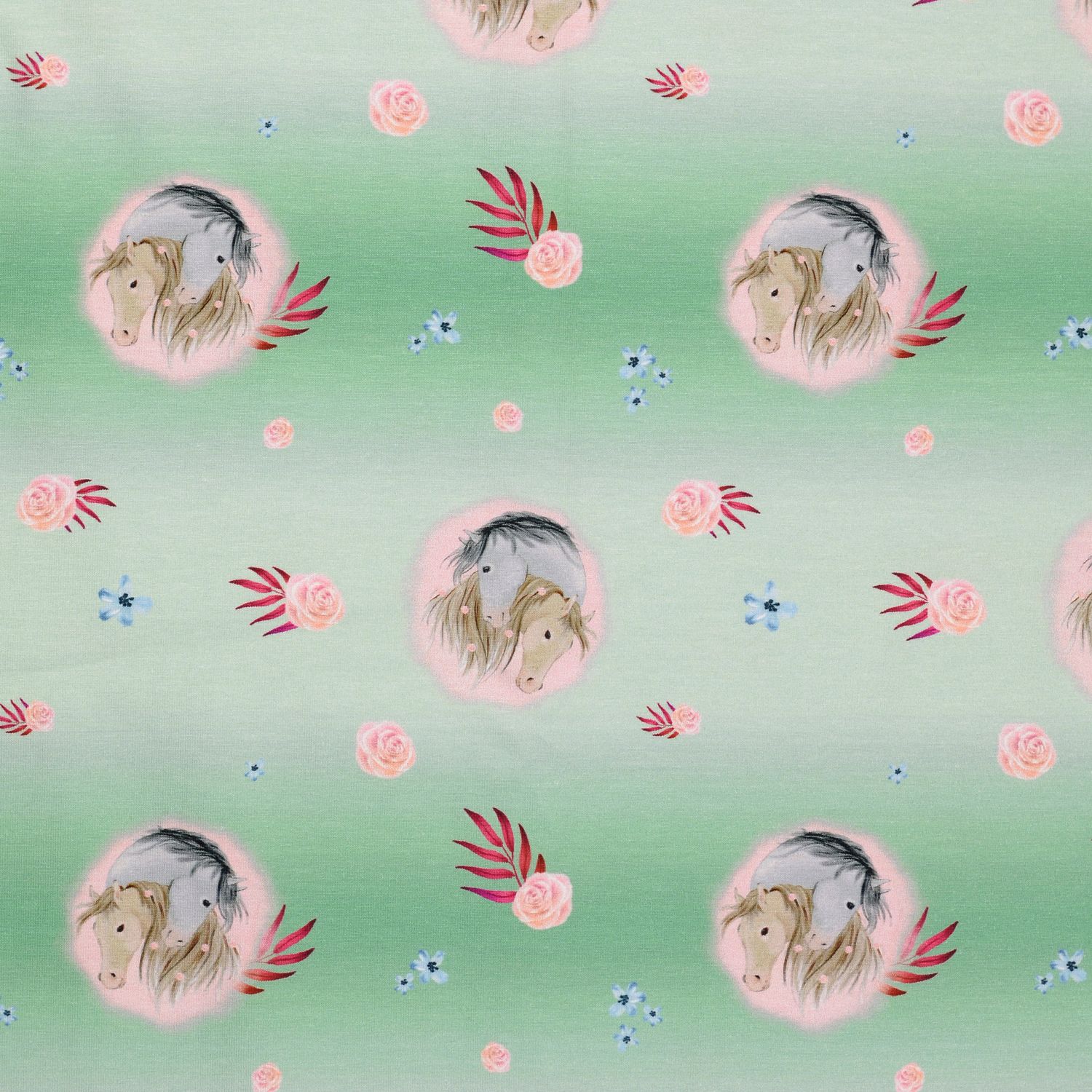 Entre los retratos de caballos se entrelazan pequeñas flores, pétalos y hojas en colores armoniosos – delicados tonos rosa y rosa viejo, crema discreta y un fresco verde hoja. El fondo verde claro recuerda a un prado veraniego y resalta hermosamente los motivos.