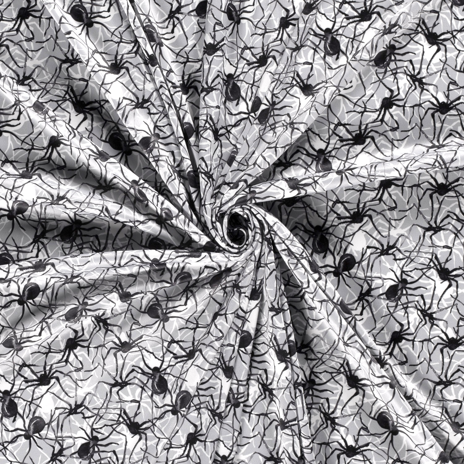 ¡Este jersey de carnaval está hecho para todos los pequeños y grandes fans de las arañas! Sobre un fondo gris jaspeado, trepan traviesas arañas negras con grandes ojos redondos blancos – a veces cabeza abajo, a veces de lado, siempre con una mirada pícara. Finas telarañas oscuras y pequeños puntos alrededor dan al diseño un aspecto vivo, ligeramente espeluznante, pero aún así amigable para los niños.