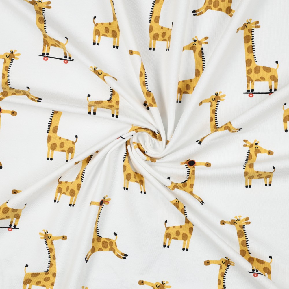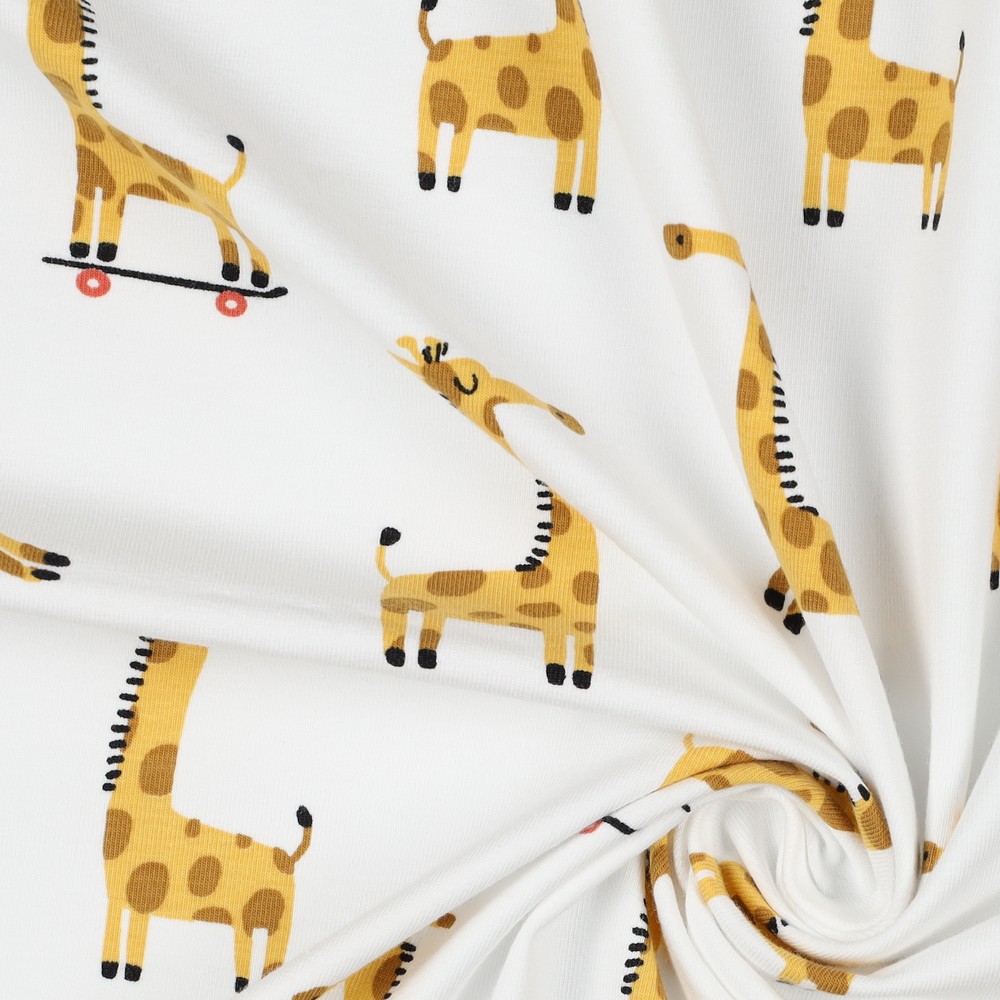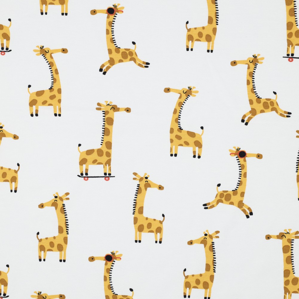 La tela está hecha para ropa infantil moderna – ya sean camisetas, leggings, pantalones bombachos, vestidos o pijamas cómodos. Pero también accesorios como gorros, pañuelos o mantas ligeras se convierten en un verdadero atractivo con las jirafas de tendencia.