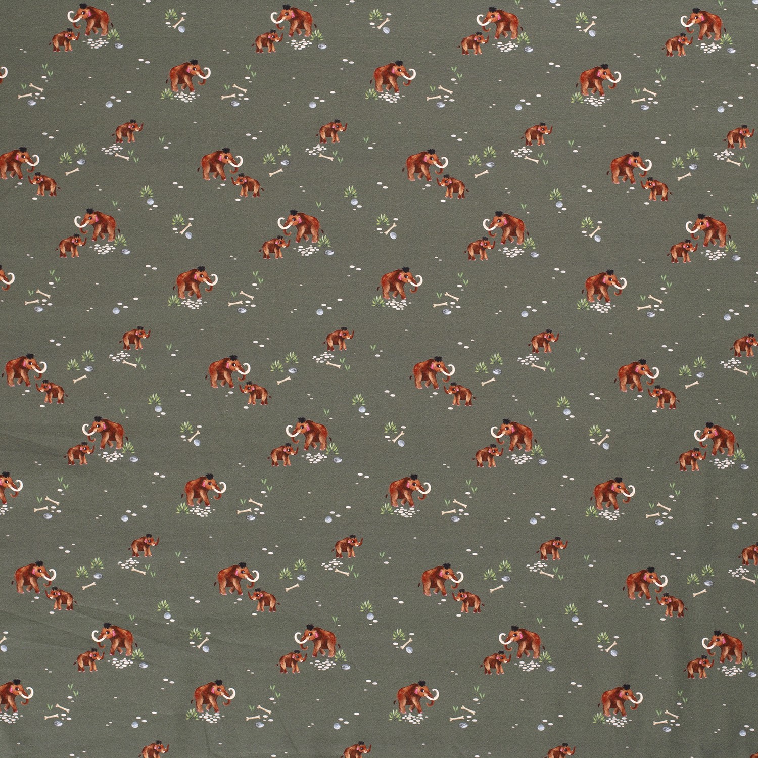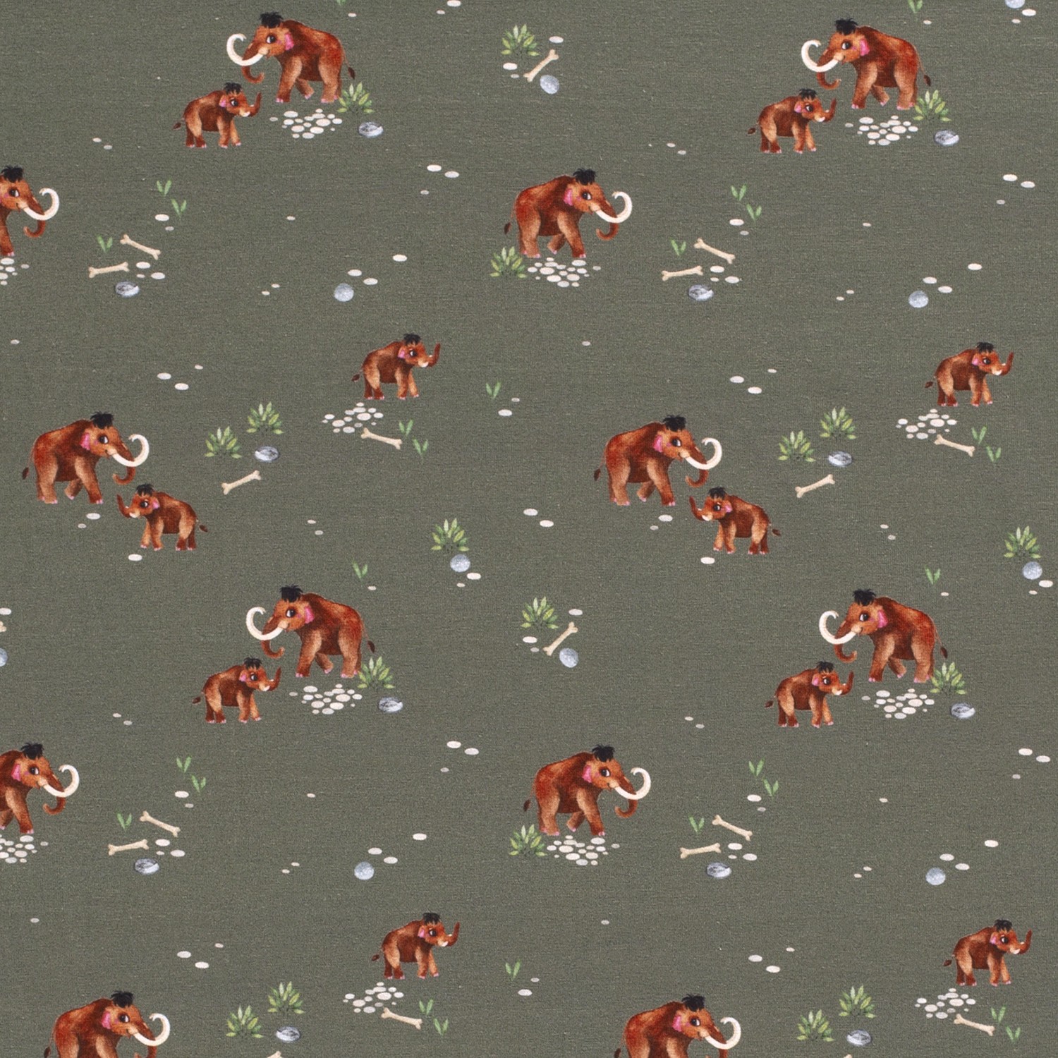 Los colores están armoniosamente combinados: marrón cálido y beige para los mamuts, tonos naturales delicados para la hierba, hojas y piedras, y un tranquilo kaki de fondo. El diseño se ve vivo sin ser demasiado colorido, ideal para ropa moderna de niños y bebés.