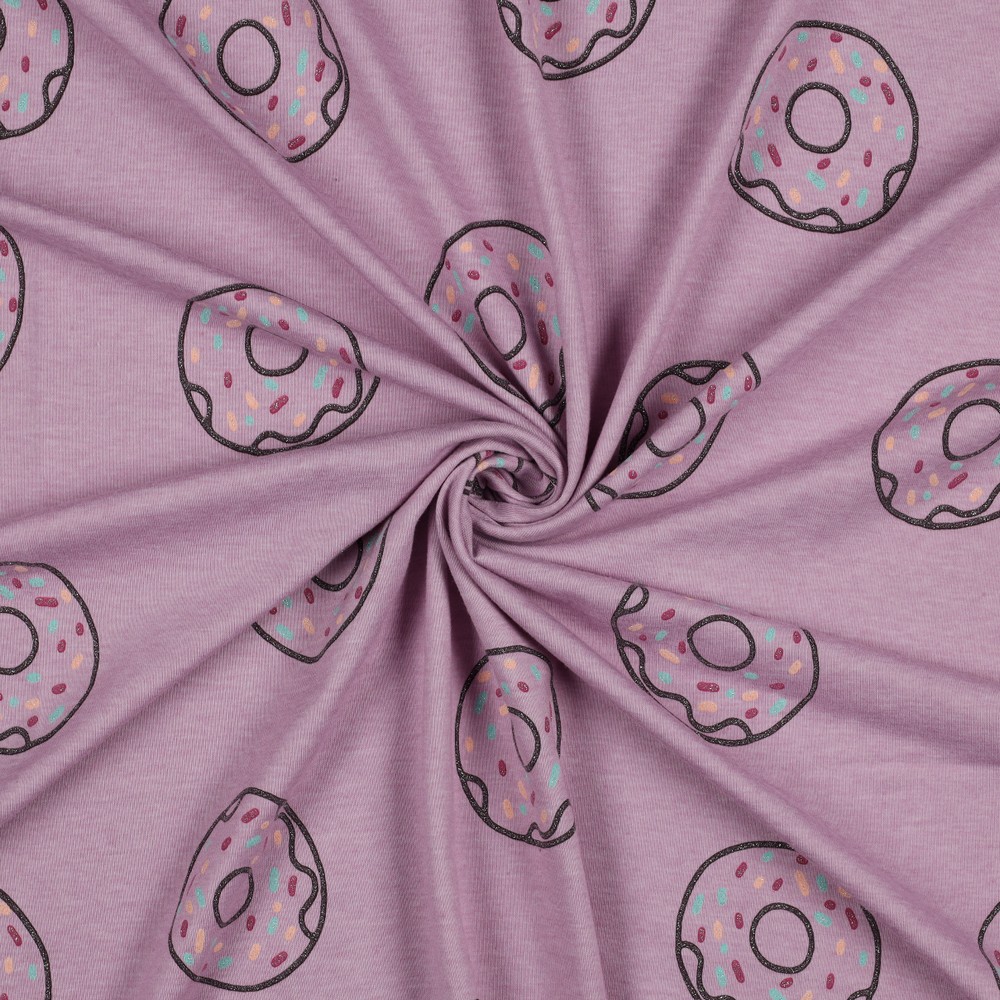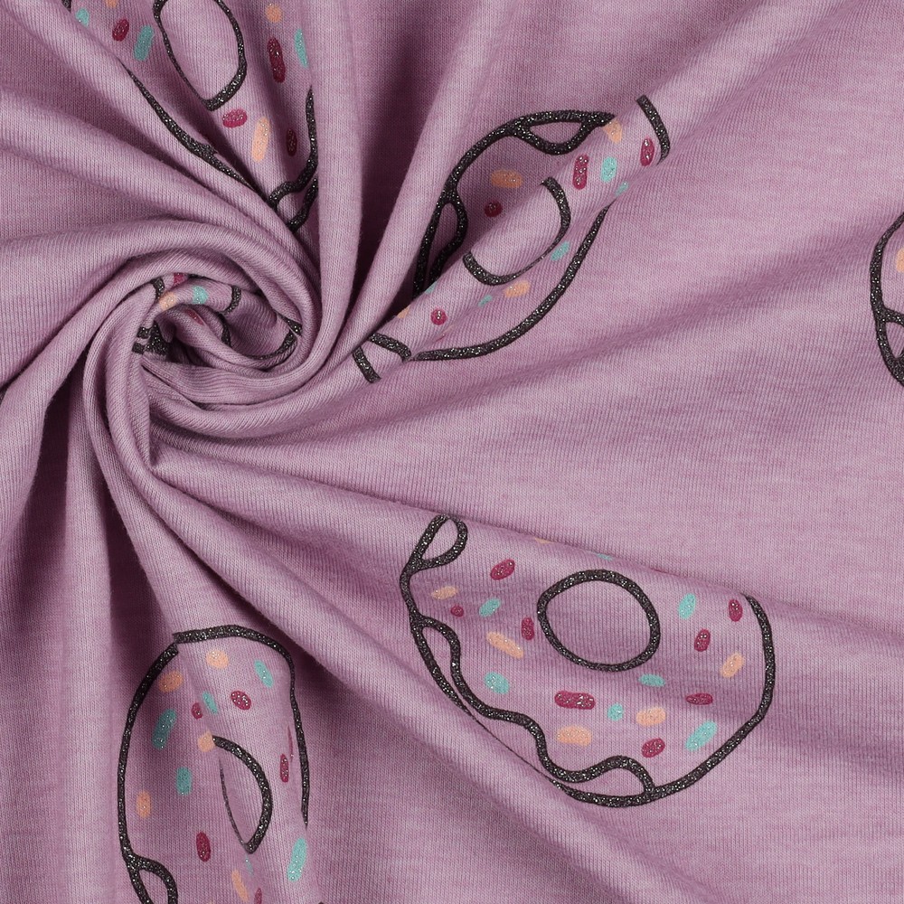 Este jersey dulce seduce con un mar de donuts brillantes sobre un suave melange lila claro. Donuts coloridos y detallados con chispas y glaseado se dispersan por la tela y son realzados elegantemente por un fino efecto brillante – juguetón, pero con estilo.