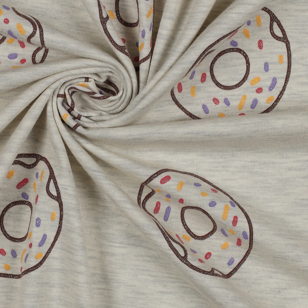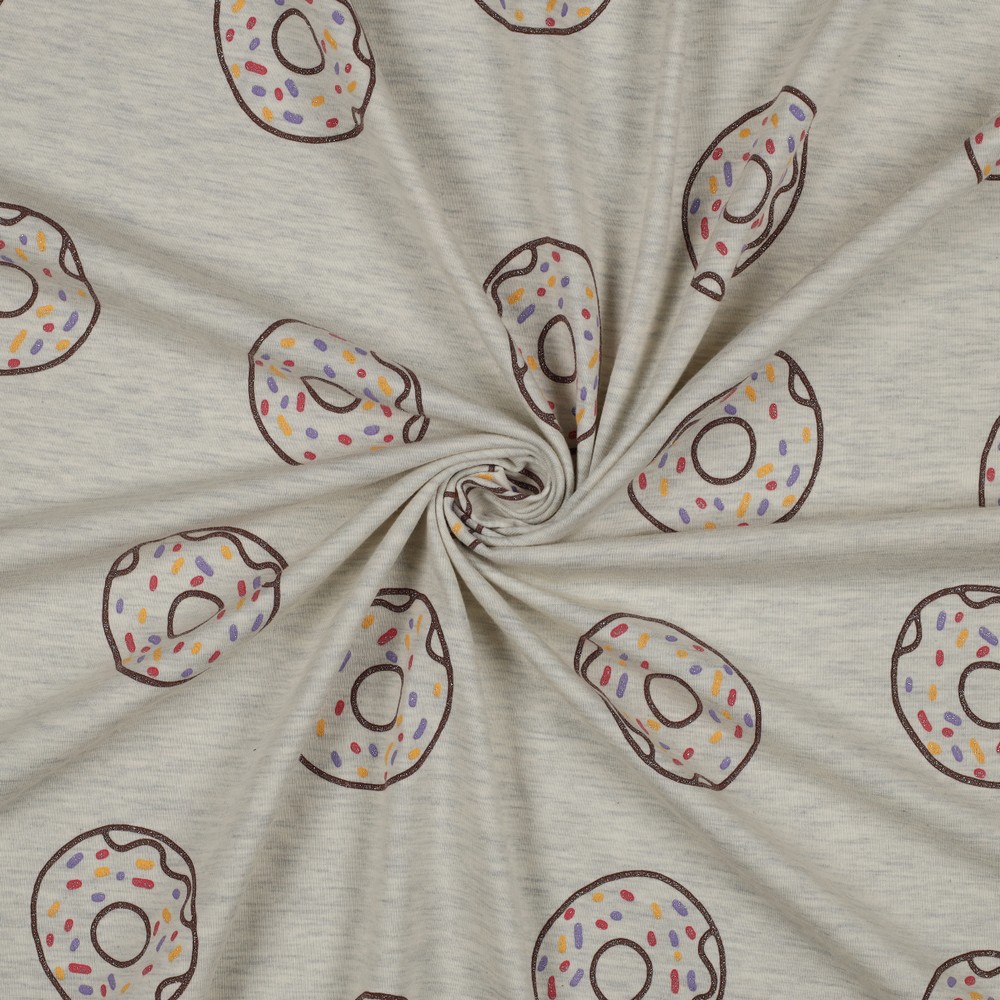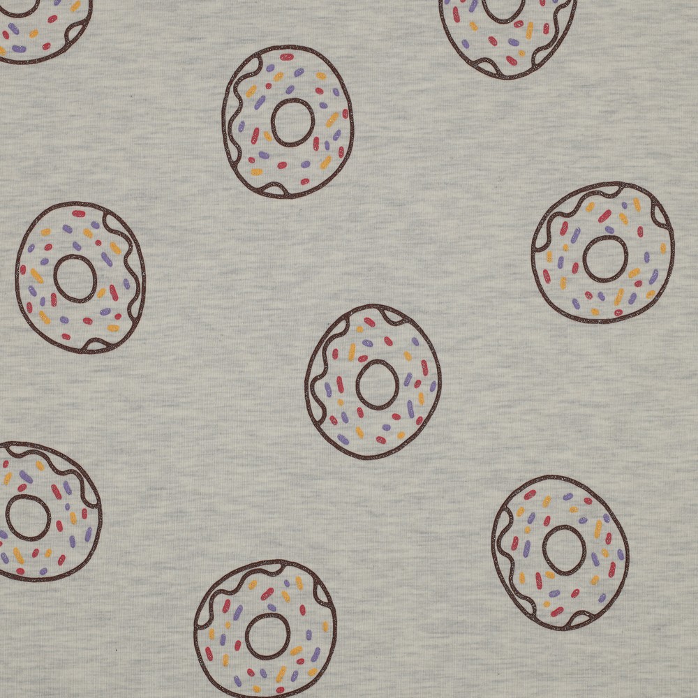Este jersey juguetón encanta con un diseño de donuts dulces sobre un fondo gris jaspeado. El glaseado, las chispas y los efectos brillantes hacen que los pequeños donuts cobren vida y aporten buen humor a cualquier proyecto de costura.