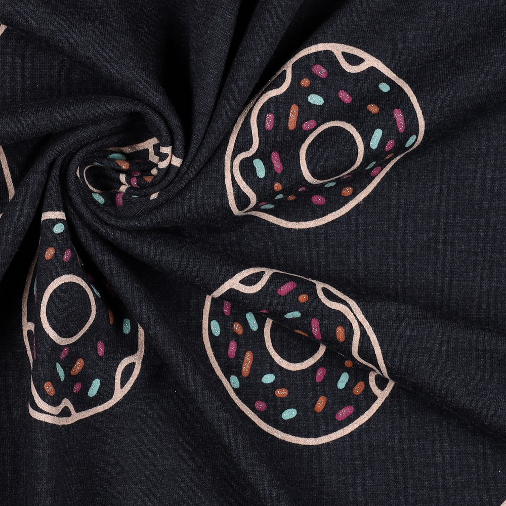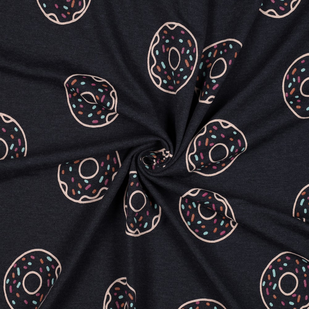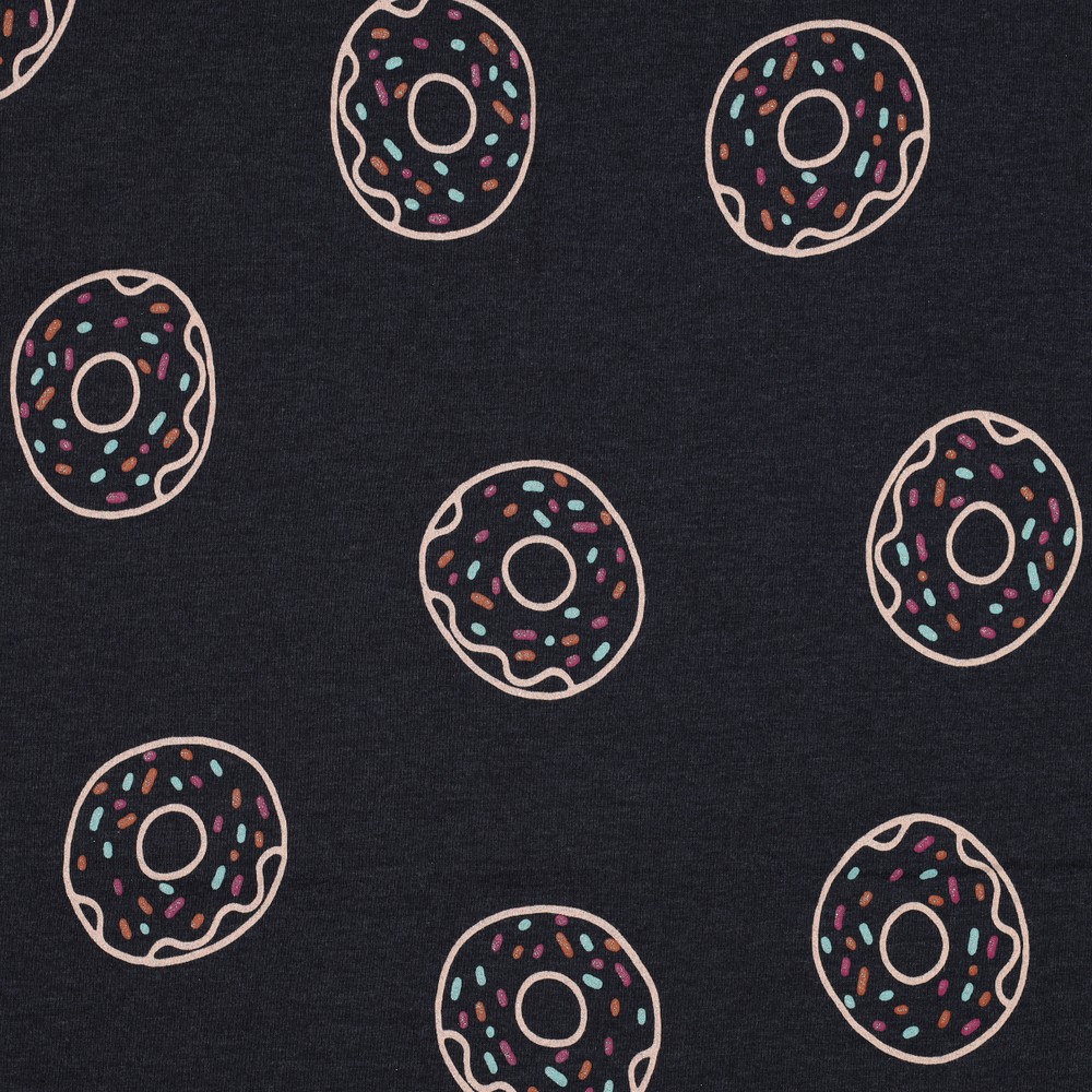Este jersey juguetón en azul índigo melange es un verdadero atractivo para todos los amantes de los dulces y fans de los donuts. Sobre el suave fondo, bailan donuts coloridos en rosa, fucsia, turquesa, amarillo y azul, algunos con detalles brillantes que le dan al diseño un look brillante y ligeramente juguetón.