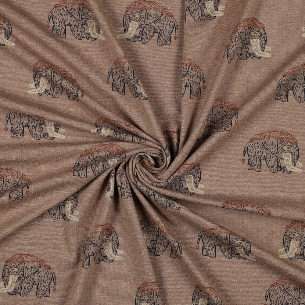 Este simpático jersey presenta pequeños mamuts de aspecto amistoso retozando sobre un fondo moteado de color topo. El fino aspecto melange confiere al tejido un efecto moderno y ligeramente texturizado, mientras que los suaves tonos naturales crean un aspecto tranquilo y acogedor.