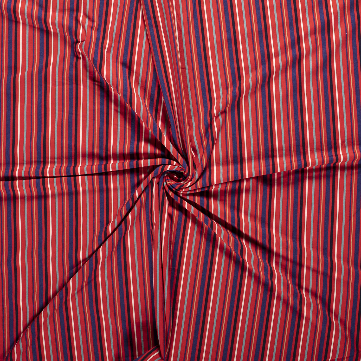 Este jersey aporta rayas de colores frescas a tus proyectos de costura: finas y uniformes multirayas en tonos cálidos rojos y rosas, combinadas con delicados matices blancos y beige, que crean un aspecto vivo pero armonioso. Las rayas estrechas se ven modernas y deportivas a la vez – perfecto para quienes aman las líneas claras y un diseño atemporal.