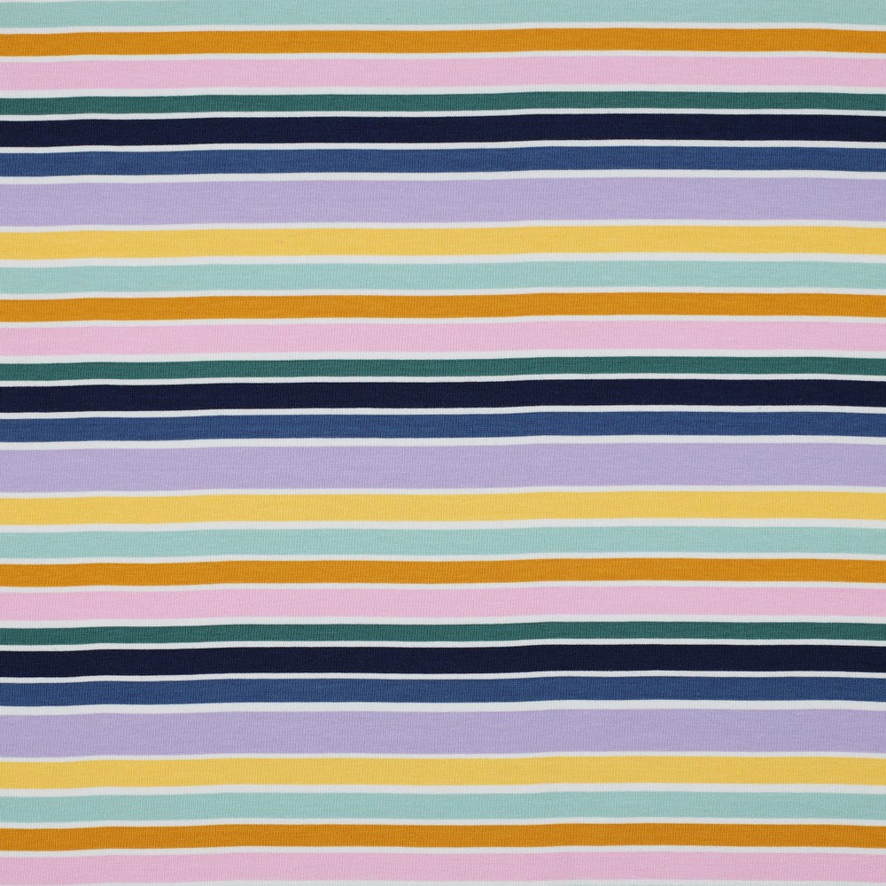 Una mezcla alegre de rayas para quienes aman los colores vivos y divertidos: en este jersey se alternan finas rayas en rosa suave, amarillo cálido, menta fresca, turquesa vibrante, rosa intenso y gris discreto. Los colores parecen parches cuidadosamente ensamblados que en conjunto crean un look armonioso y moderno.