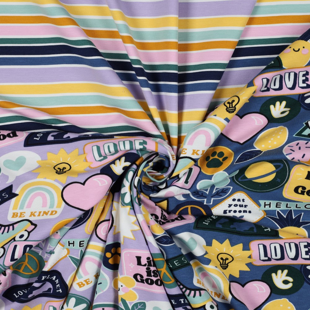 La tela es ideal como compañero para jerseys estampados – por ejemplo con motivos de patchwork, animales o flores – aportando acentos de color sin ser dominante. Ya sea ropa infantil, camisetas, leggings, faldas o ropa cómoda para casa: este tejido combinado aporta ligereza y buen humor a cualquier proyecto de costura.