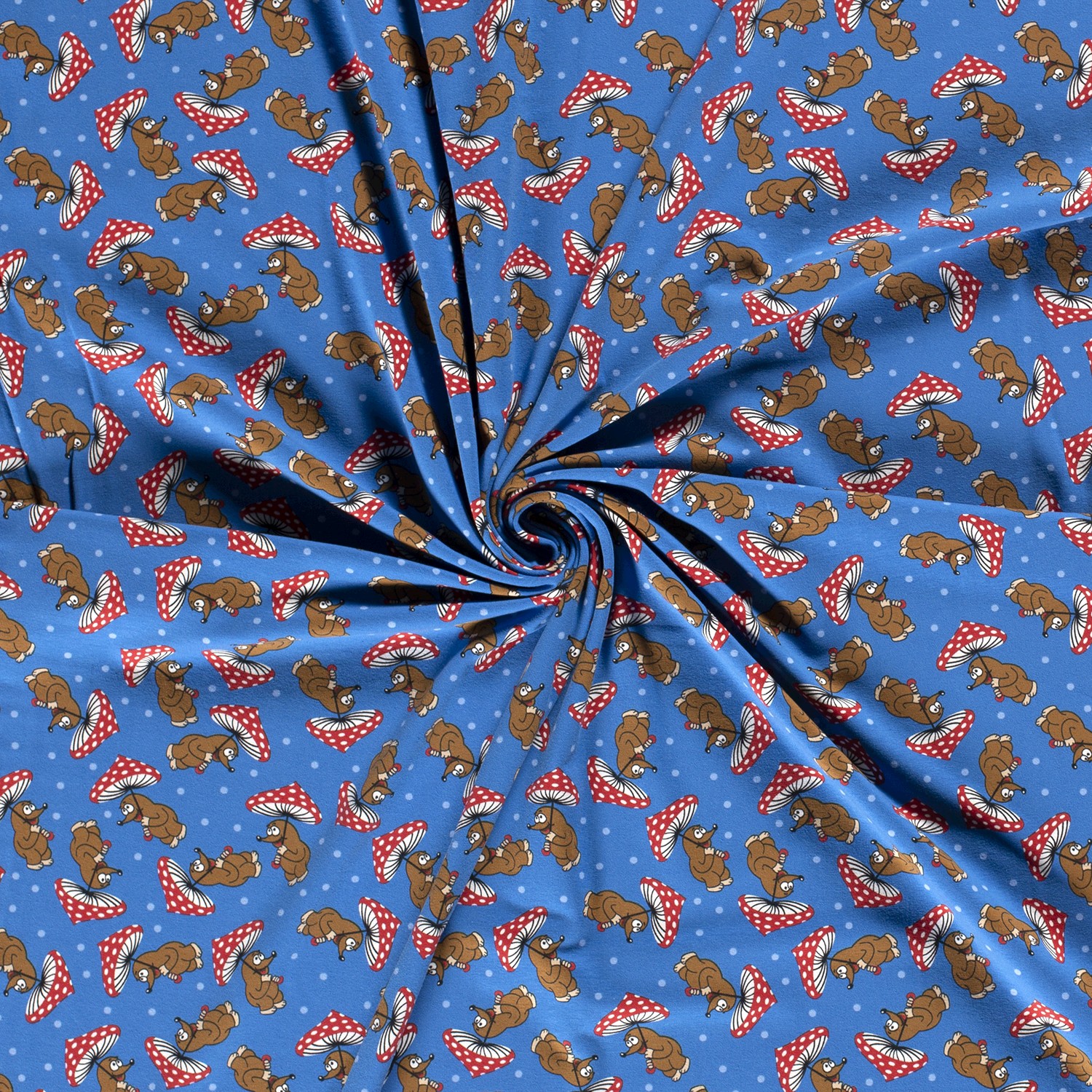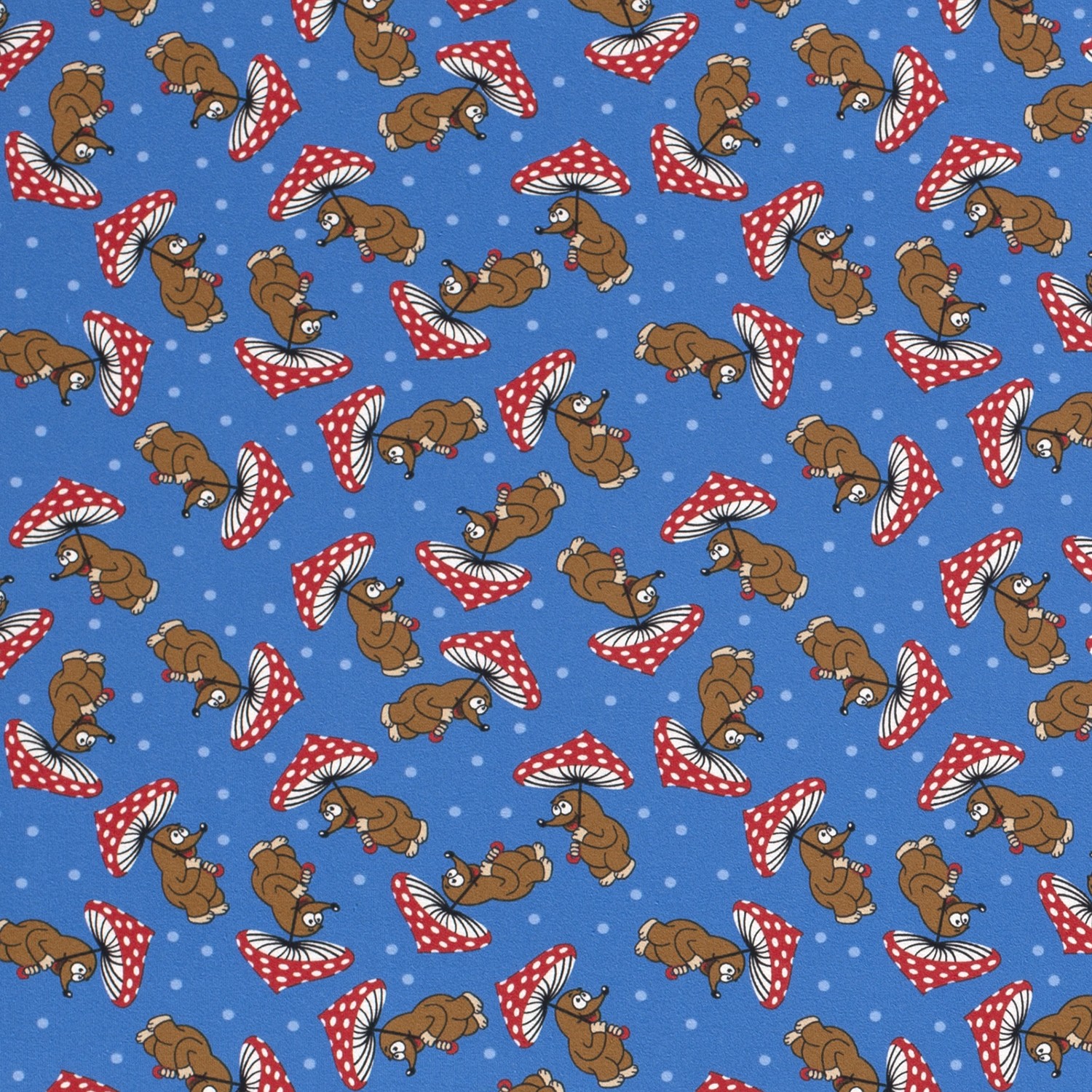 Un pequeño topo con una gran sombrilla de seta: este jersey cuenta toda una historia. Sobre un delicado cielo azul claro, se divierten tiernos topos que se protegen de la lluvia bajo brillantes setas rojas con puntos blancos. Entre ellos, pequeños puntos y detalles cariñosos añaden acentos alegres.