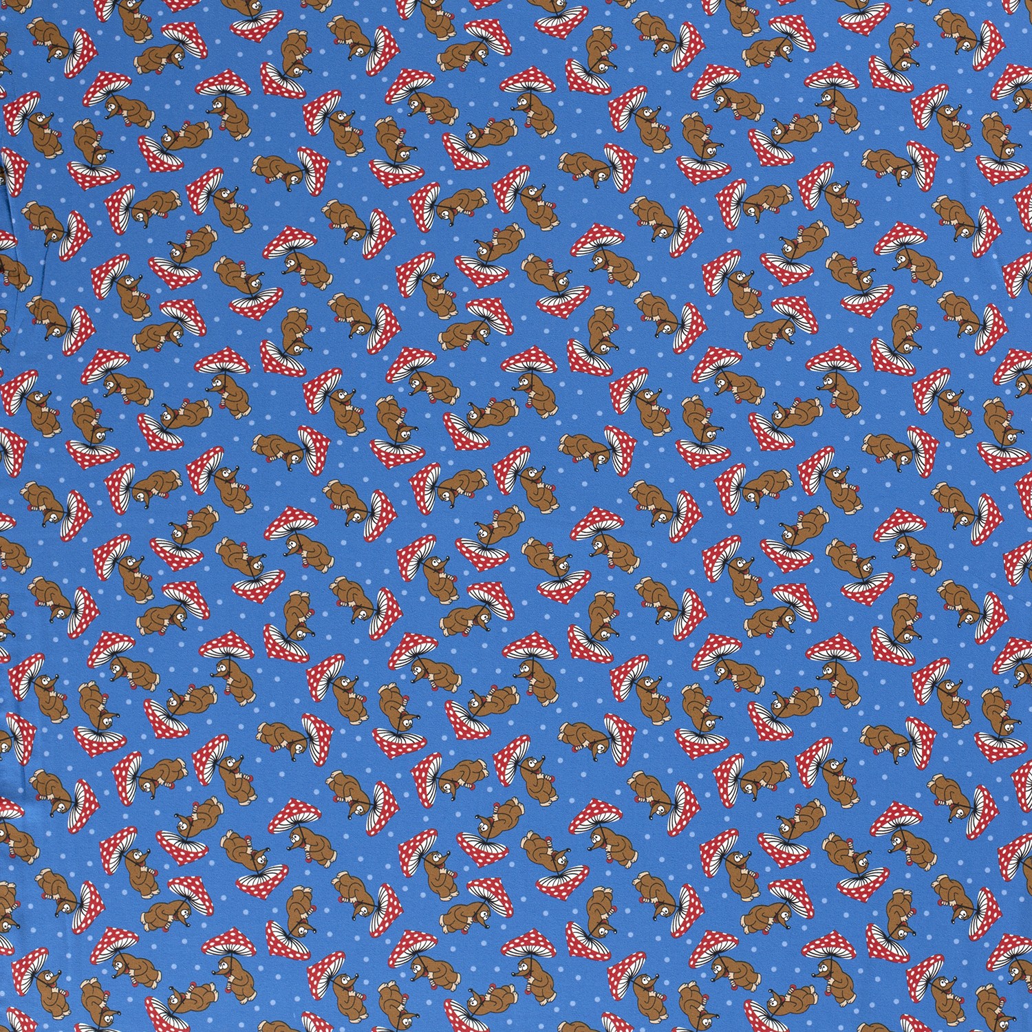 Los colores están armoniosamente combinados: el suave azul celeste como fondo tranquilo, tonos cálidos marrones en el topo, rojo intenso y blanco puro en la seta – un diseño juguetón pero no demasiado llamativo que inmediatamente alegra el ánimo.