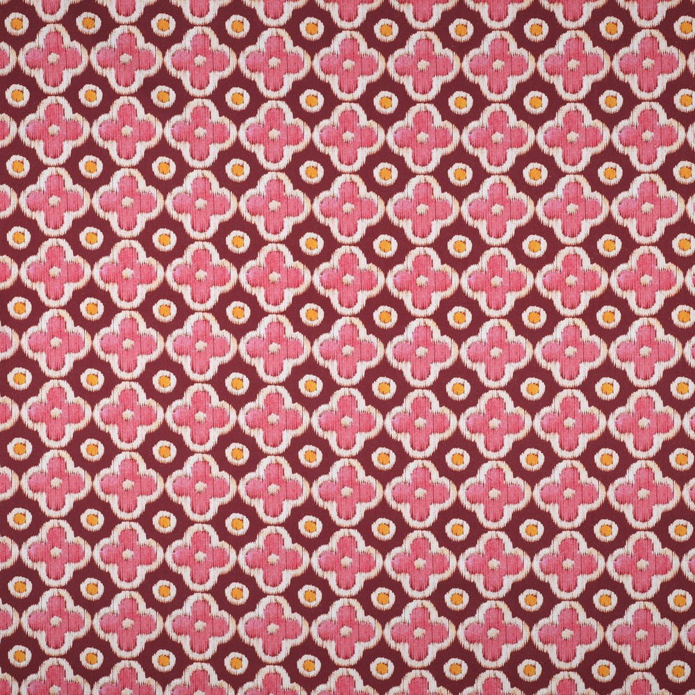 Un tejido como un paseo otoñal a la luz del atardecer: delicadas flores en cálidos tonos crema y rosa brillan sobre el profundo tono burdeos, con pequeños puntos irregulares intercalados, que dan al diseño una ligereza juguetona. Los motivos florales parecen dibujados con cariño -a veces ligeramente más grandes y llamativos, a veces más finos y sobrios- y se distribuyen armoniosamente por todo el tejido.