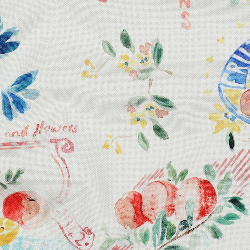 Una cesta de frutas veraniega en tela: sobre el fondo ecru suavemente jaspeado, se despliegan frutas ilustradas con gran detalle en colores cálidos y naturales. Naranjas jugosas, limones brillantes, melocotones delicados y bayas en tonos rojos y violetas forman un patrón armonioso y alegre que evoca inmediatamente el ambiente vacacional.