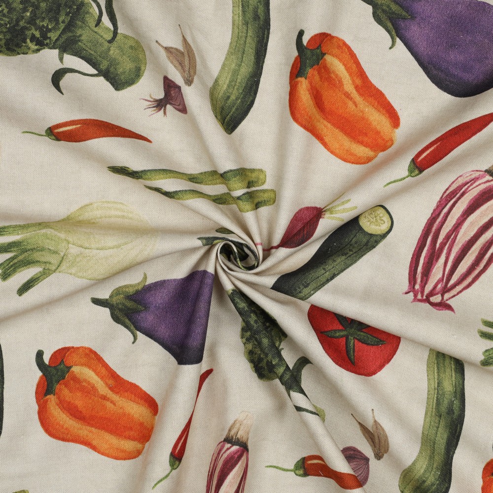 Este encantador lienzo de algodón trae la fresca atmósfera del mercado directamente a tu taller de costura. Sobre un fondo beige cálido, se despliegan verduras ilustradas con cariño: tomates jugosos, zanahorias crujientes, pimientos amarillos brillantes, berenjenas moradas, cebollas, hierbas y muchos otros tesoros coloridos del huerto. Los motivos están dibujados con detalle y parecen pequeñas ilustraciones en acuarela: naturales, vivos y modernos a la vez.