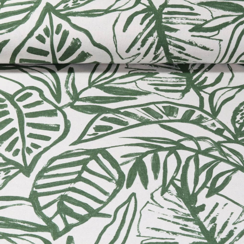 Un toque de estilo para tus proyectos de costura: Hojas delicadamente pintadas en varios tonos de verde -desde un suave salvia hasta un intenso verde bosque- se extienden sobre un fondo cálido de color beige. Las hojas parecen esbozadas con un pincel y confieren al diseño una ligereza natural y artística.