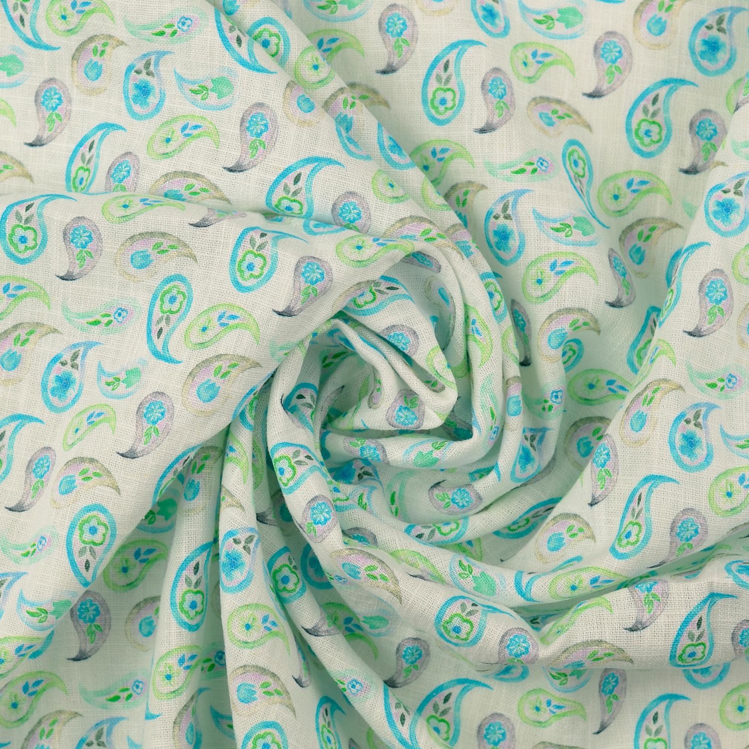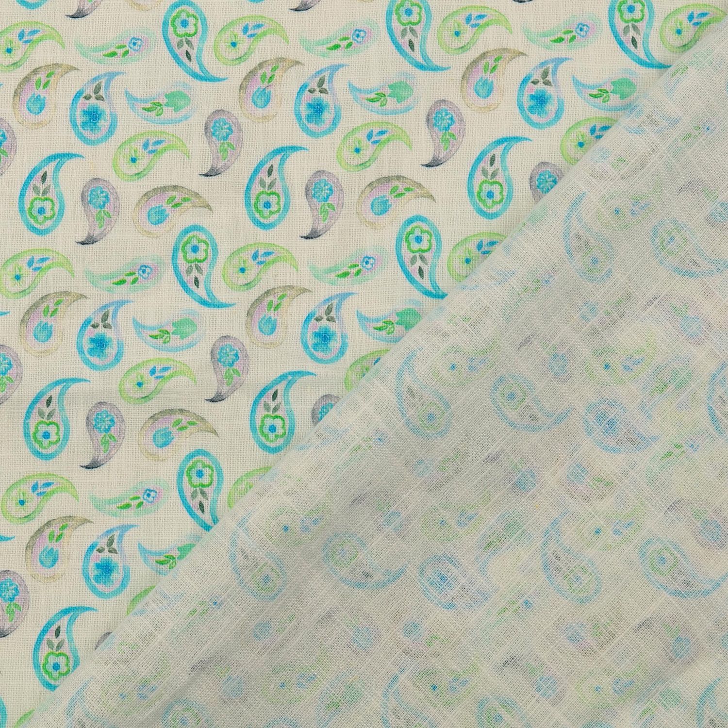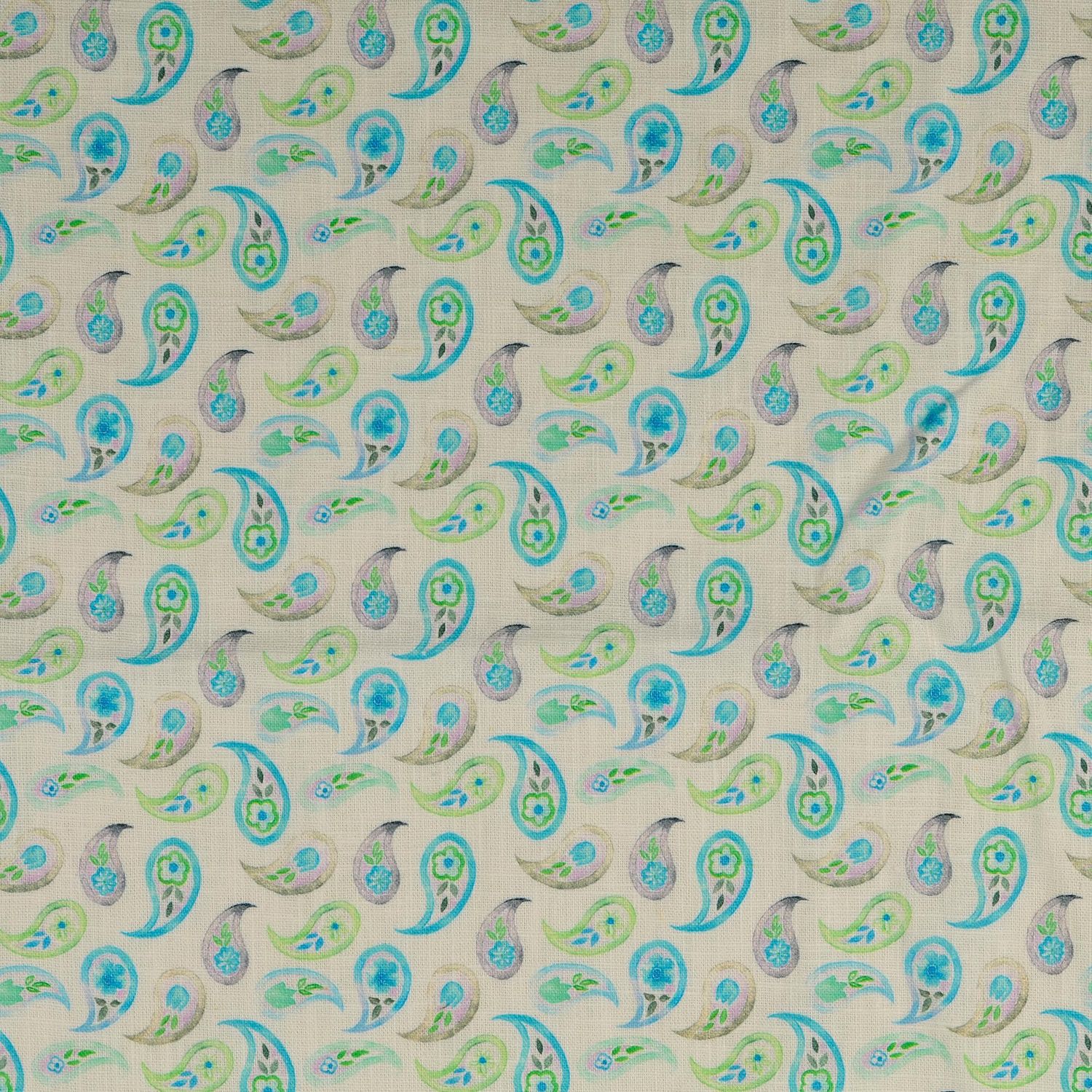 Lino - Estampado Digital Lavado Paisley Blanco Turquesa