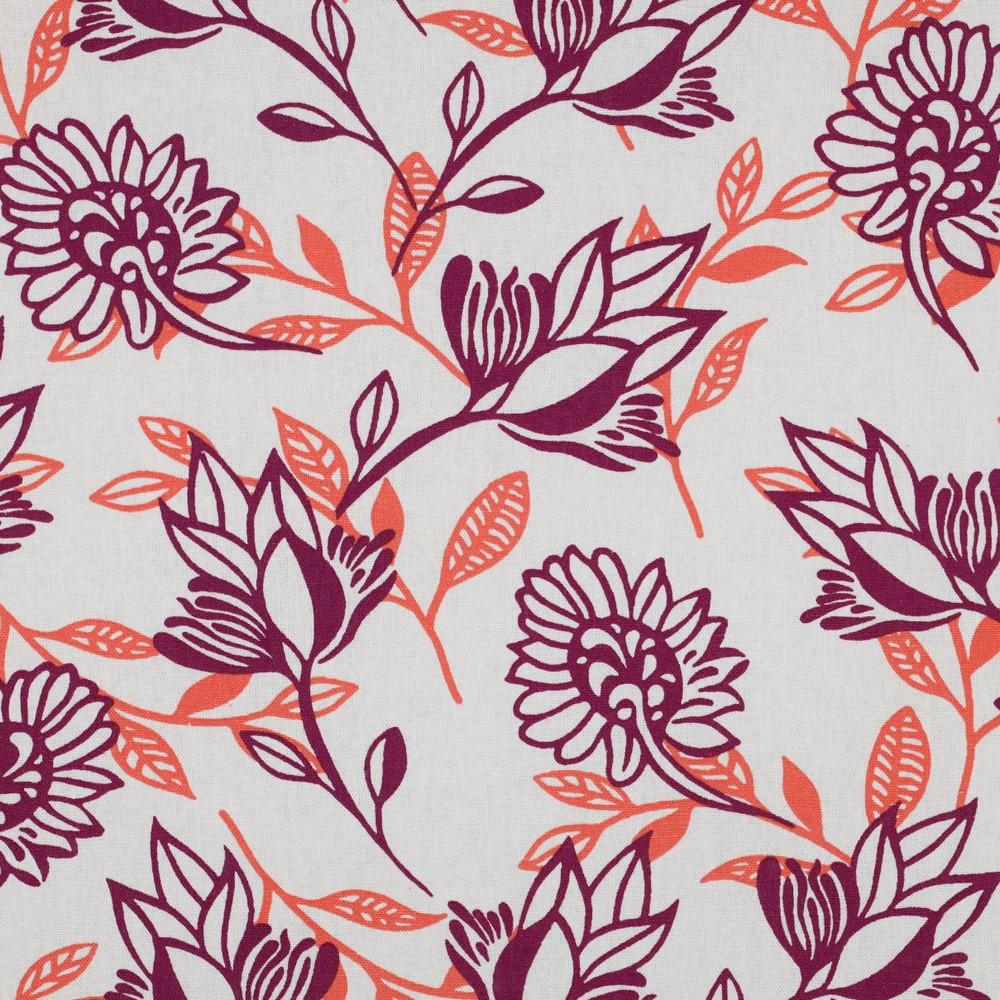 Un sueño floral veraniego: un alegre estampado floral en colores delicados y vibrantes se despliega sobre el fondo de lino de fina textura. El blanco brillante prepara el escenario para alegres flores en morado y naranja, enmarcadas por suaves tonos amarillos y toques más oscuros. Entre medias, pequeñas hojas y finos detalles en colores apagados crean un armonioso equilibrio.