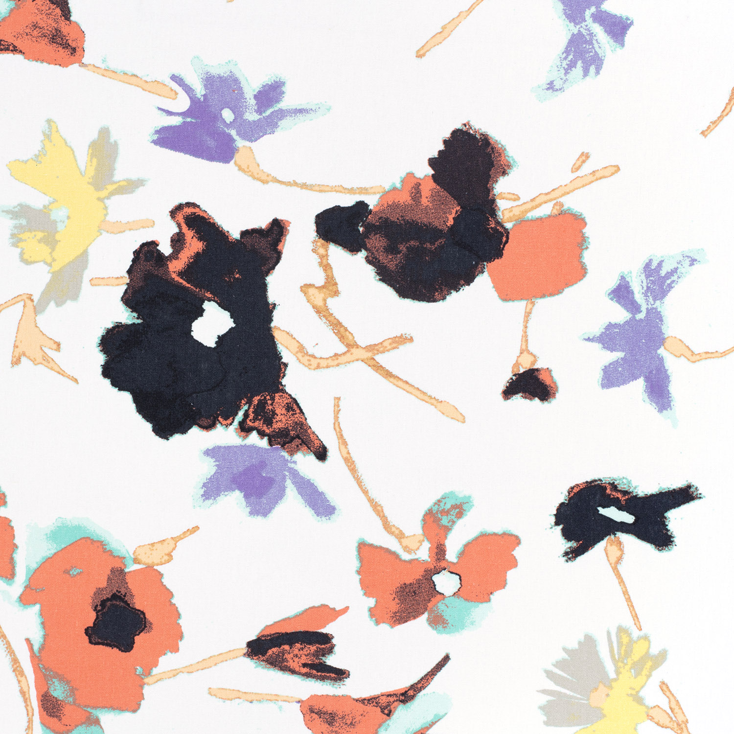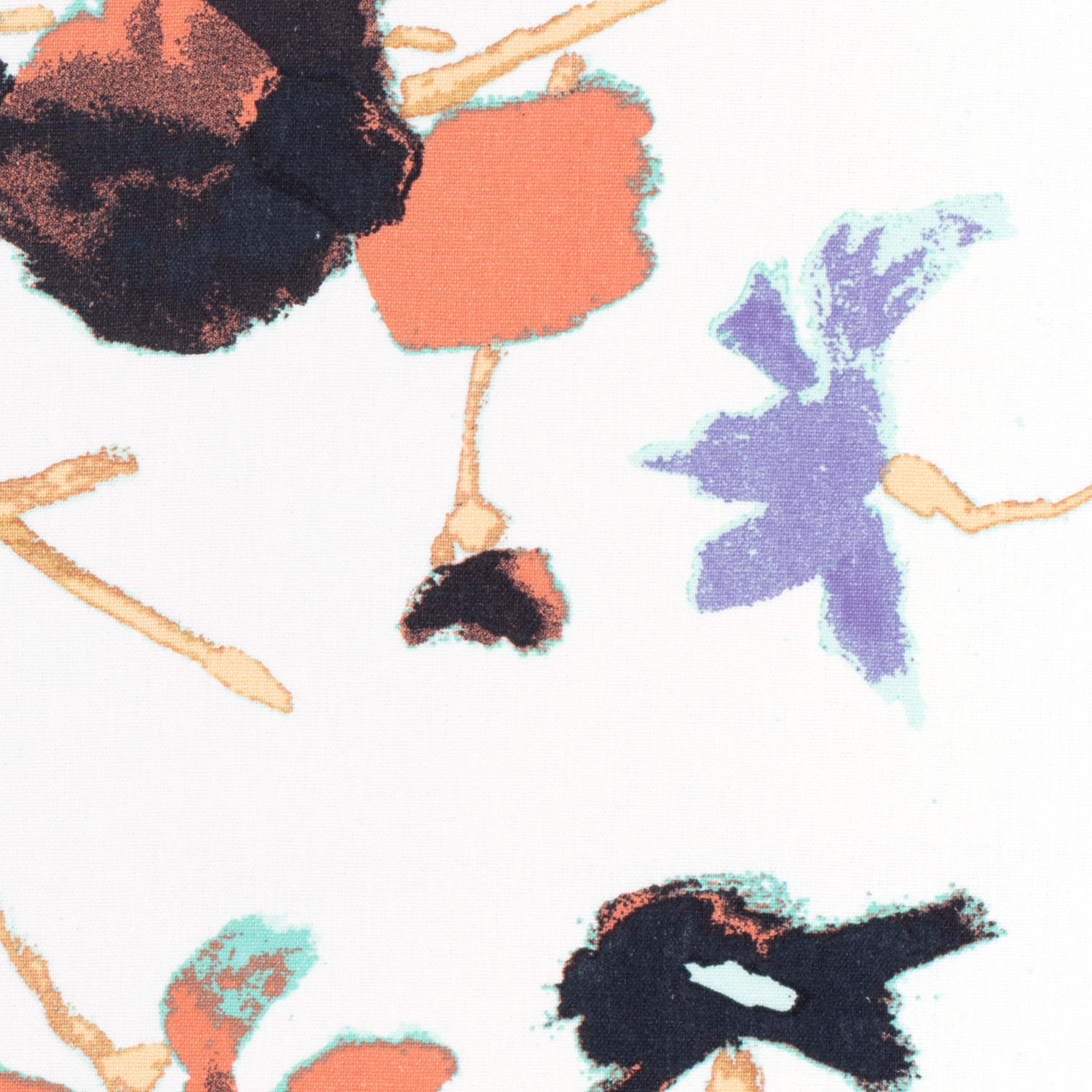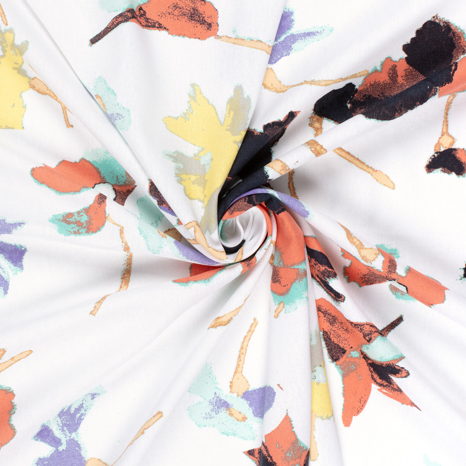 Un toque de verano en la tela: Sobre un fondo blanco brillante, florecen grandes flores detalladamente dibujadas en tonos cálidos rosados y bayas, acompañadas delicadamente por finas hojas en suaves tonos verdes. Las flores parecen pintadas – femeninas, elegantes y a la vez maravillosamente modernas.