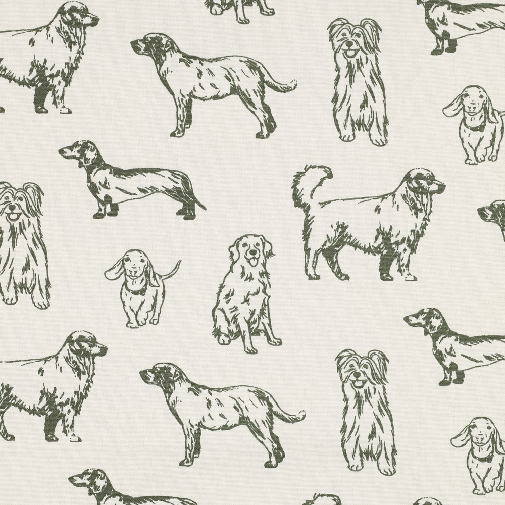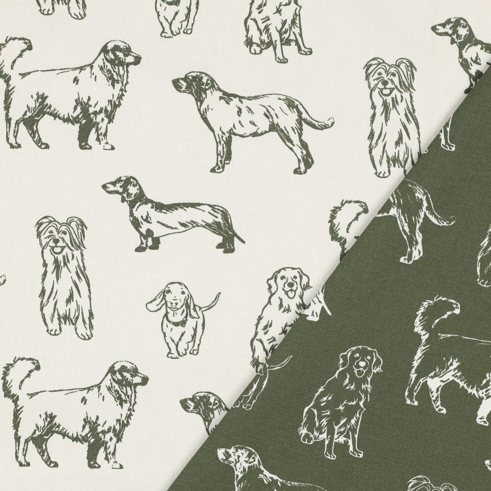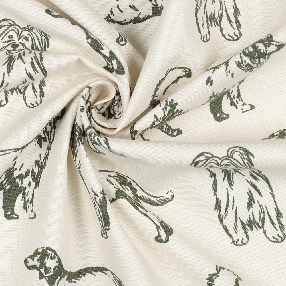 Una tela para enamorarse: sobre el fondo natural ecru se despliegan perros alegres en varios tonos de verde, ilustrados con mucho cariño y detalles pequeños. A veces curiosos, a veces juguetones, a veces relajados: cada perro tiene su propio carácter y hace de este diseño un detalle especial.