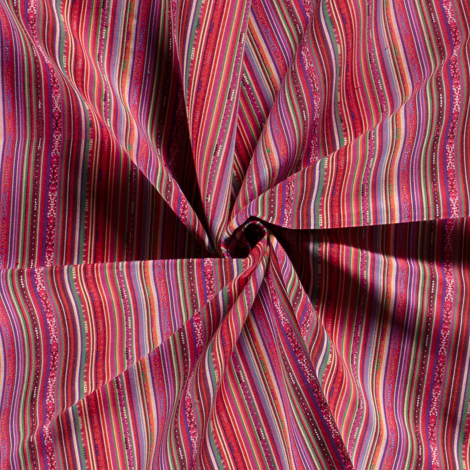 Una tela como una colorida fiesta callejera en México: un fucsia intenso se encuentra con acentos vibrantes en amarillo, turquesa, naranja y rojo para formar un patrón tejido expresivo. Los ornamentos, flores estilizadas y elementos gráficos recuerdan a los textiles tradicionales mexicanos y aportan un toque exótico y alegre al diseño.