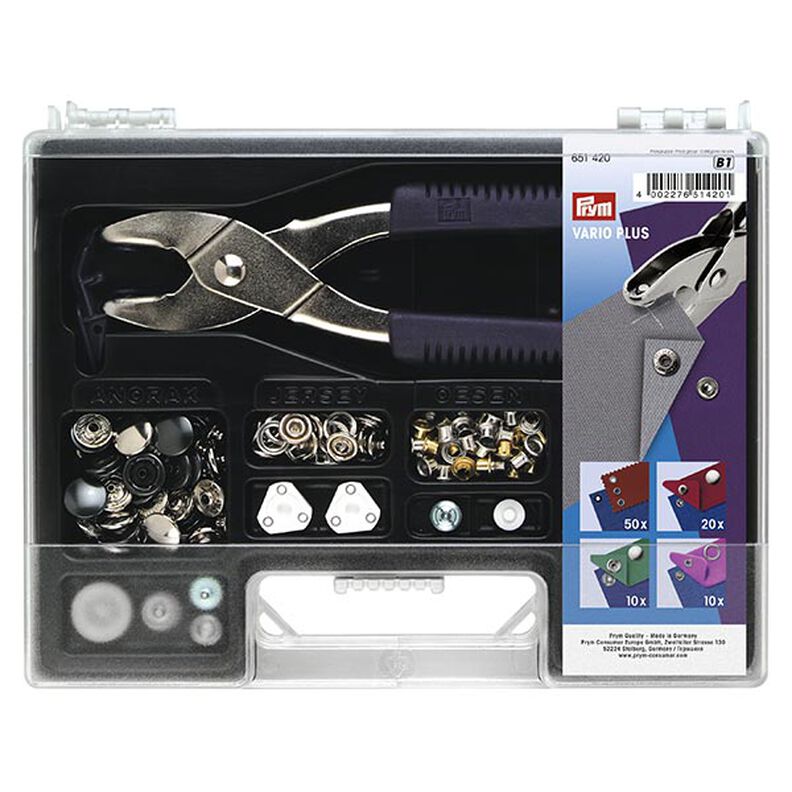 - Se incluyen: Pinzas Prym Vario, herramientas de punzonado y remachado para trabajar los botones de presión y los ojales incluidos, 10 botones de presión anorak (15 mm / color plateado), 10 botones de presión anorak (15 mm / bruñidos), 10 botones de presión Sport & Camping (15 mm , color plata), 10 botones de presión Jersey (15 mm / color plateado), 25 ojales (4 mm / color plateado), 25 ojales (4 mm / color dorado)