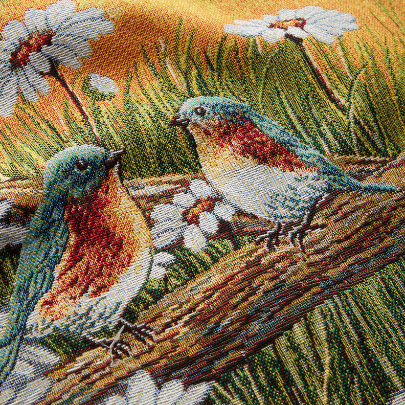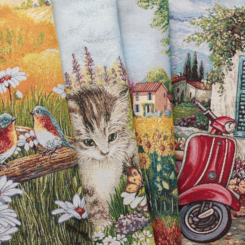 Esta maravillosa tela de tipo tapiz se caracteriza por un patrón de tipo jacquard muy atractivo. Gracias a su tipo de tejido esta tela es especialmente resistente y dimensionalmente estable y cuenta con una caída bastante rígida.