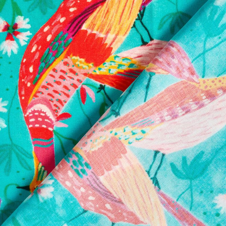 Tejido de viscosa para ropa de playa con pavos reales y flores – azul agua/rosa intenso