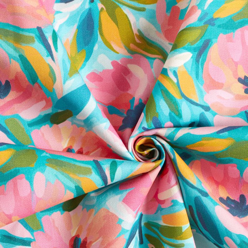 Tela decorativa Sarga de algodón Flores pintadas – rosa/turquesa