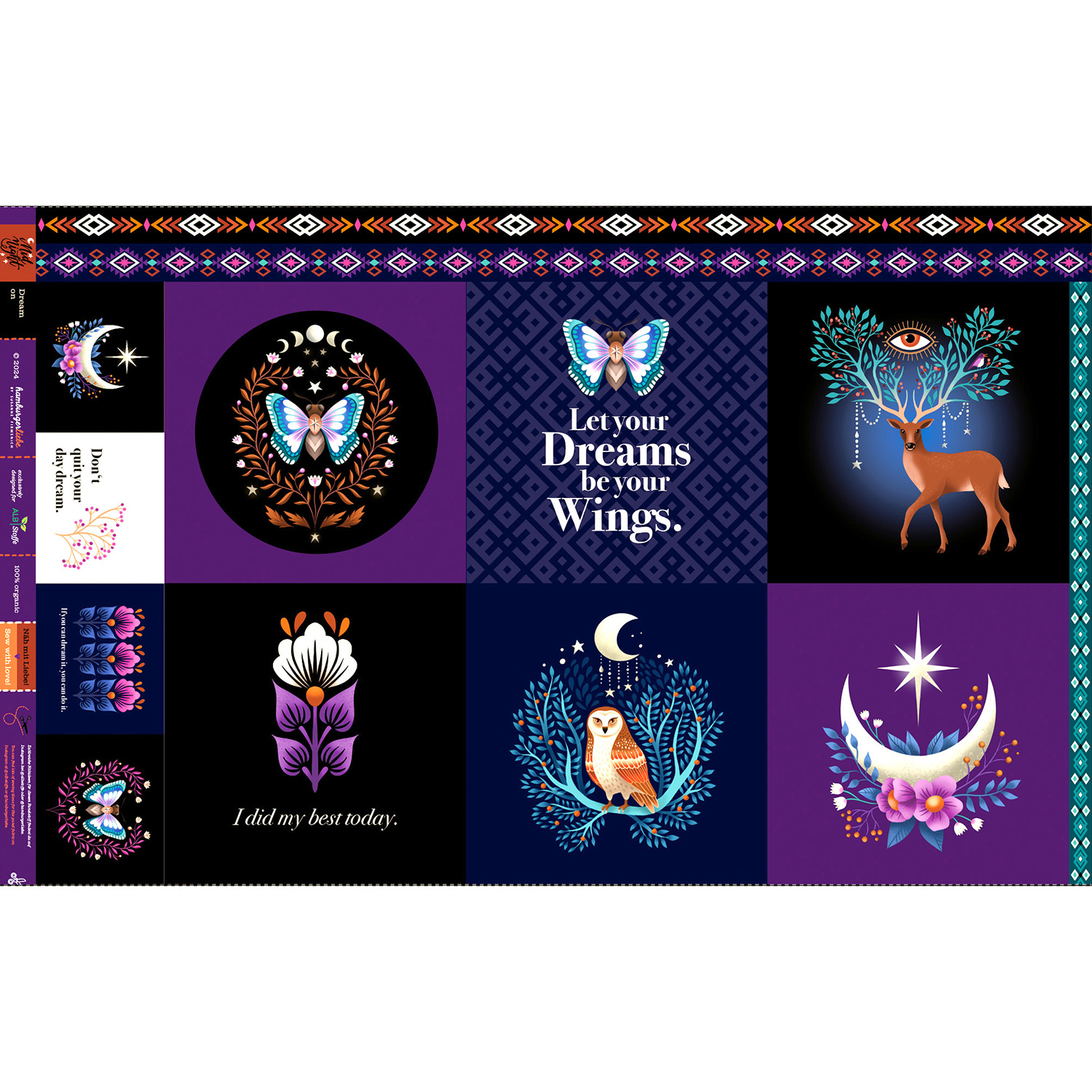 Sumérgete en el mágico mundo de la noche: motivos detallados en colores vivos y claros brillan sobre un fondo azul oscuro: desde suaves matices azules y petróleo hasta frescos acentos en rosa, amarillo y menta. El diseño parece un cuento de hadas gráfico y de ensueño, y convierte cualquier proyecto de costura en un auténtico reclamo.