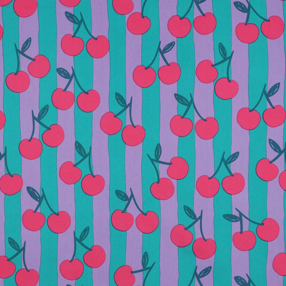 El fresco diseño cereza tiene un aspecto retro y moderno al mismo tiempo, y puede combinarse maravillosamente con telas lisas en rojo, blanco o verde. Ya sea para tu próximo vestido favorito, un proyecto de costura especial para niños o decoraciones diseñadas con cariño, esta tela te garantiza que te pondrá de buen humor y añadirá un toque veraniego durante todo el año.