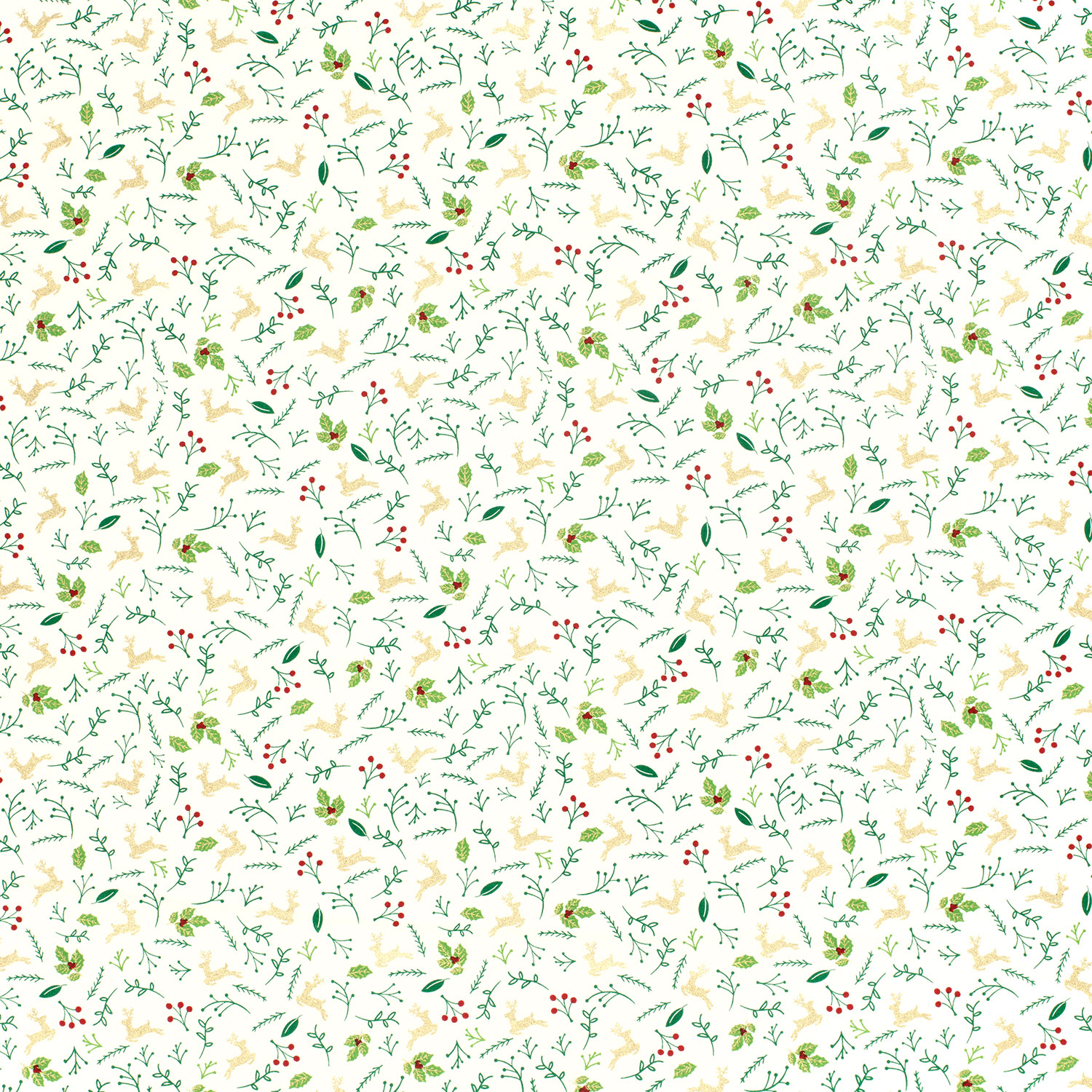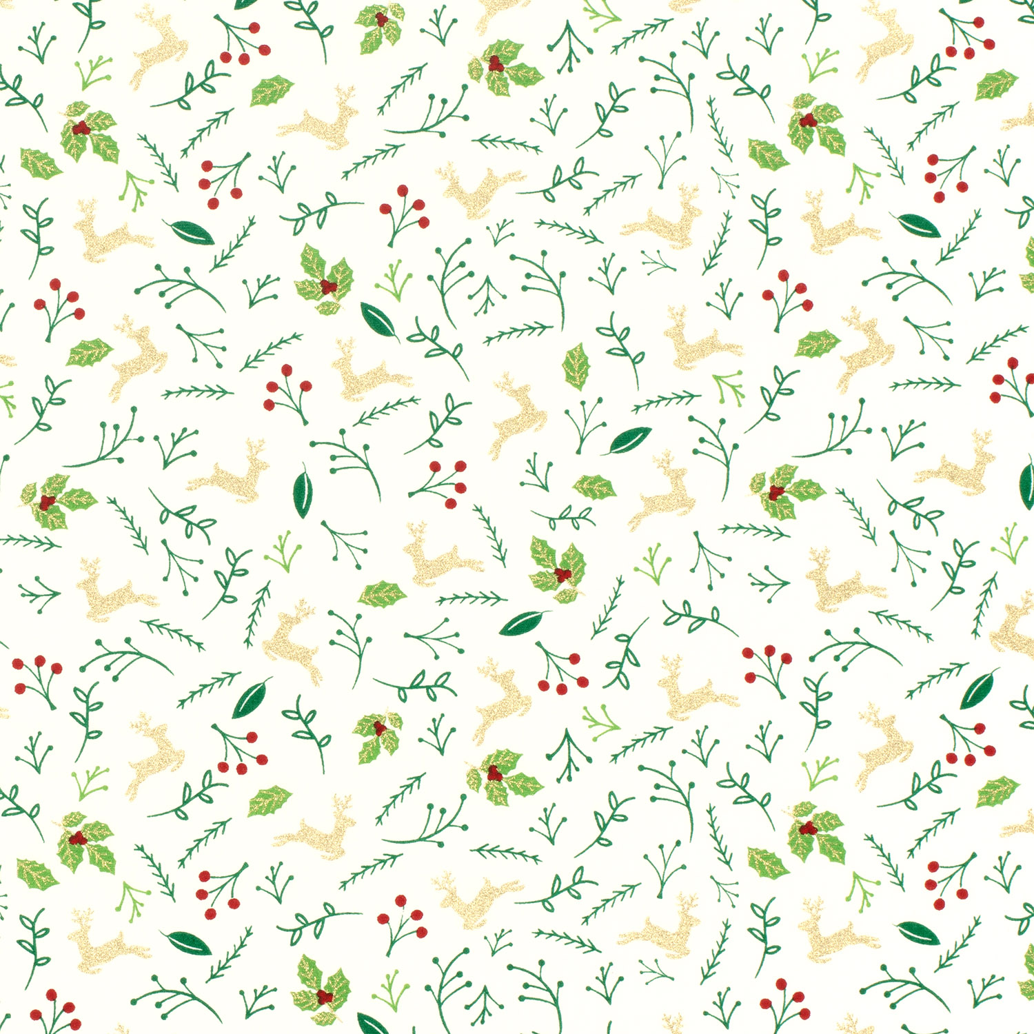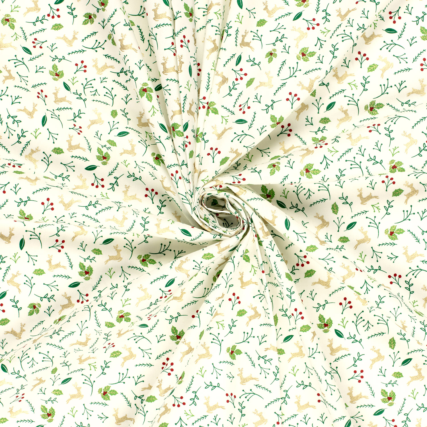 Un toque invernal para tus proyectos de costura: Elegantes ciervos retozan entre finas hojas y ramitas sobre un suave fondo de color crudo. Los delicados detalles dorados confieren al diseño un toque sofisticado y ligeramente festivo, sin resultar recargado.