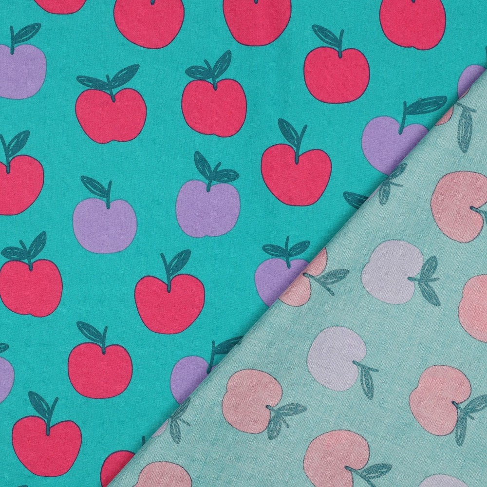 Un fresco huerto sobre tela: el rico fondo petróleo está salpicado de pequeñas manzanas estilizadas en cálidos tonos rojos y rosas delicados, acompañadas de detalles blancos que dan al diseño un aspecto vivo y alegre. Las formas claras y gráficas de las manzanas dan al estampado un aspecto moderno a la vez que juguetón, perfecto para quien adore los motivos afrutados pero no quiera que sea demasiado colorido.