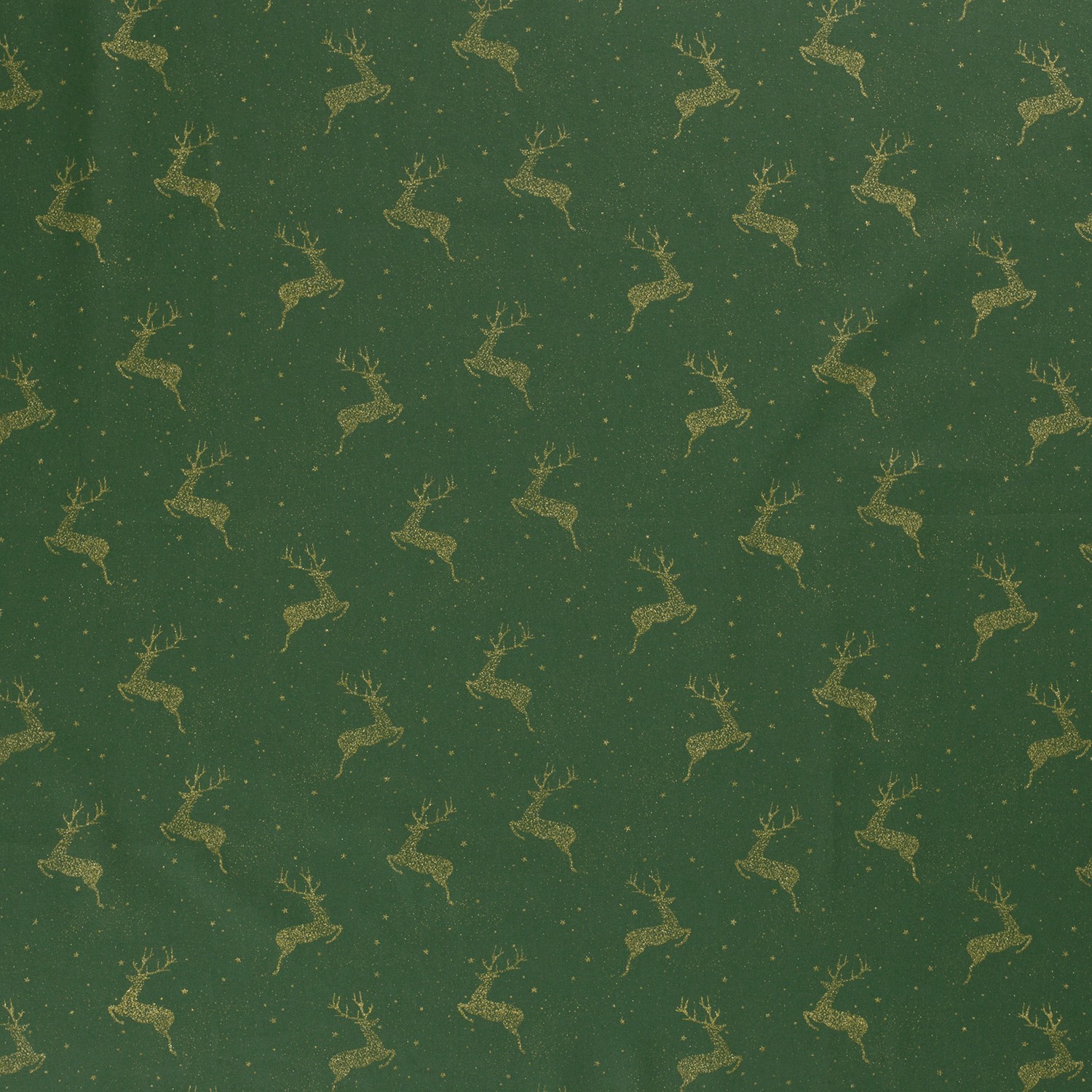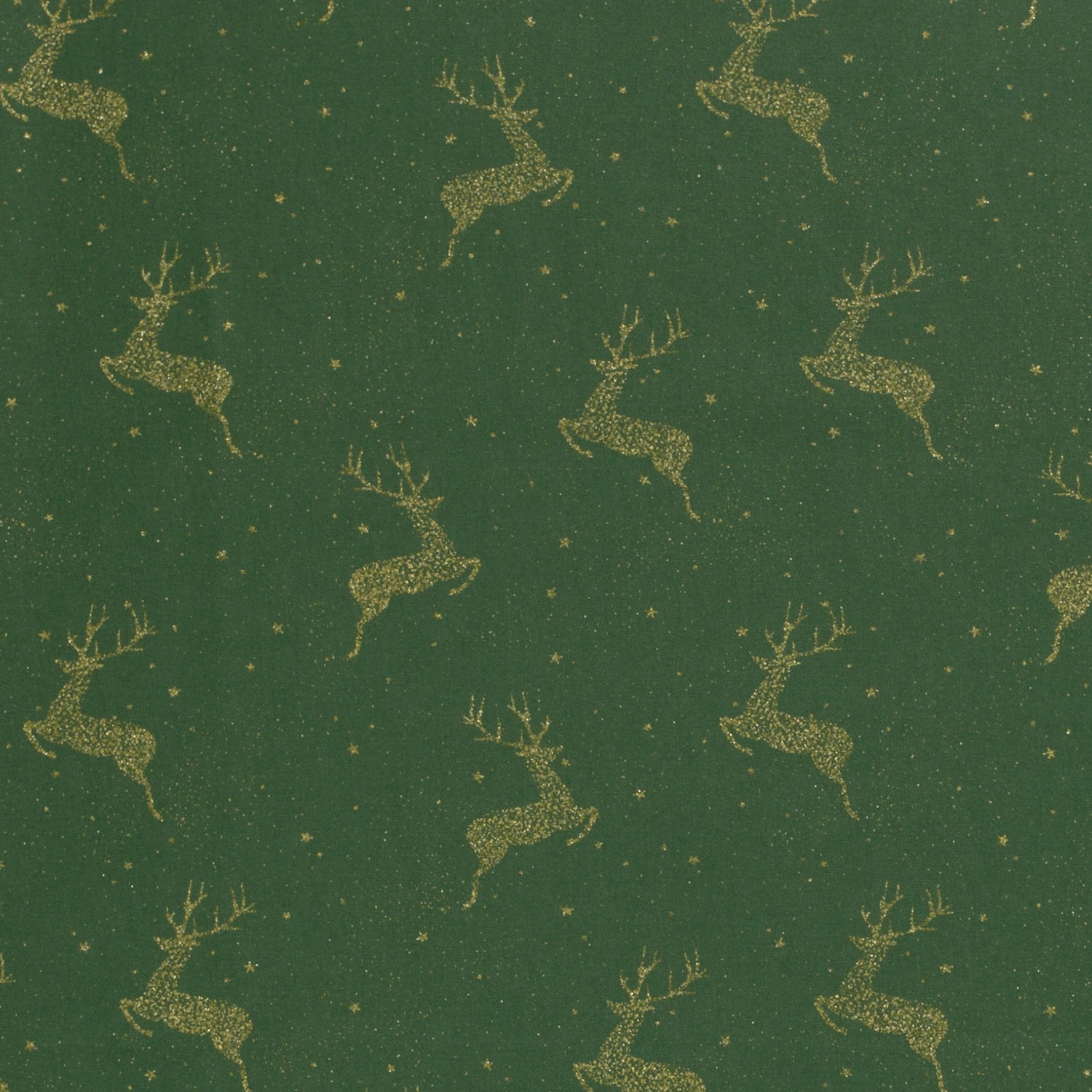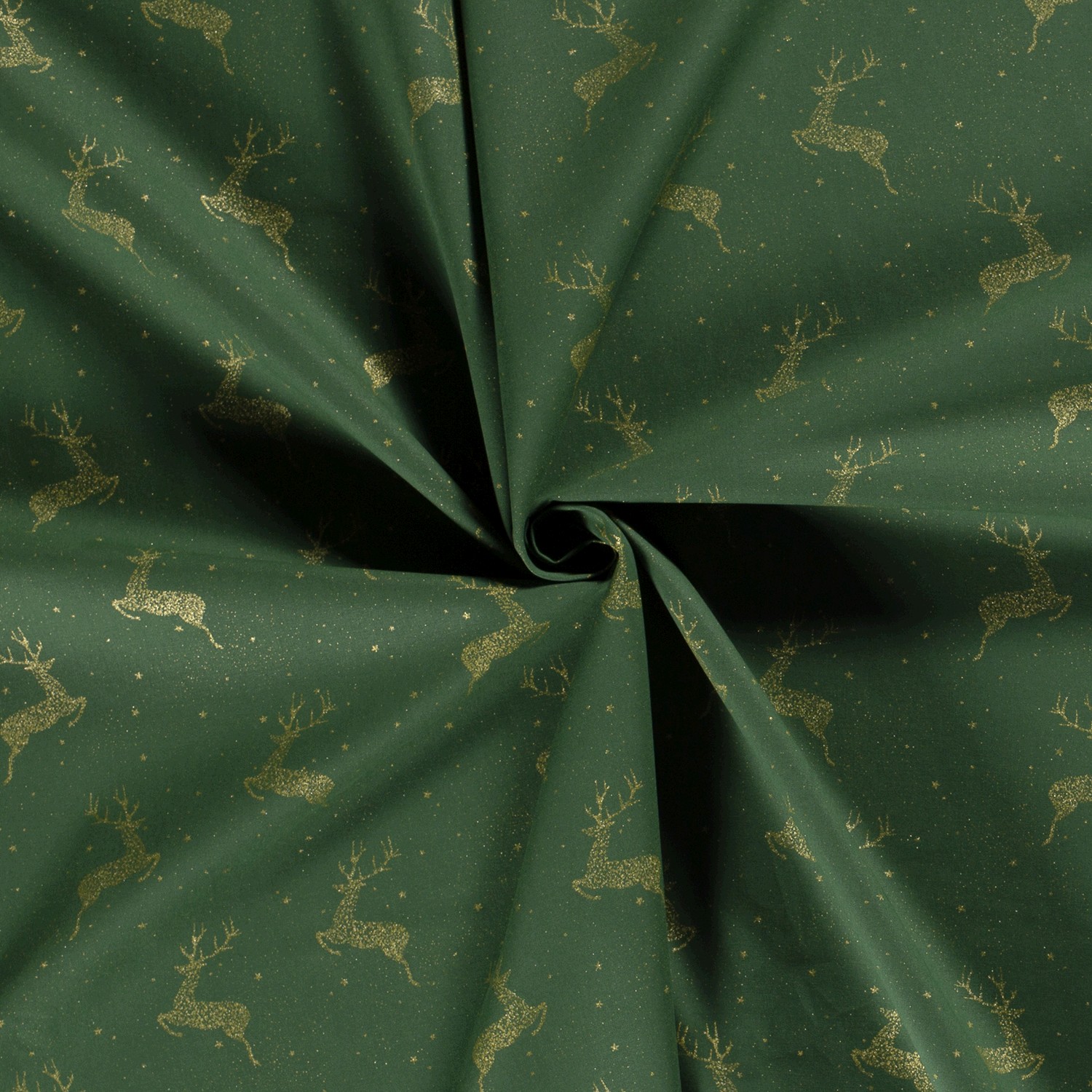 Una tela como un paseo invernal por el bosque: sobre un fondo verde abeto oscuro, elegantes ciervos en cálido dorado se desplazan. Finos puntos y detalles delicados hacen que el motivo sea festivo pero natural, perfecto para quienes aman un look navideño elegante y no demasiado juguetón.