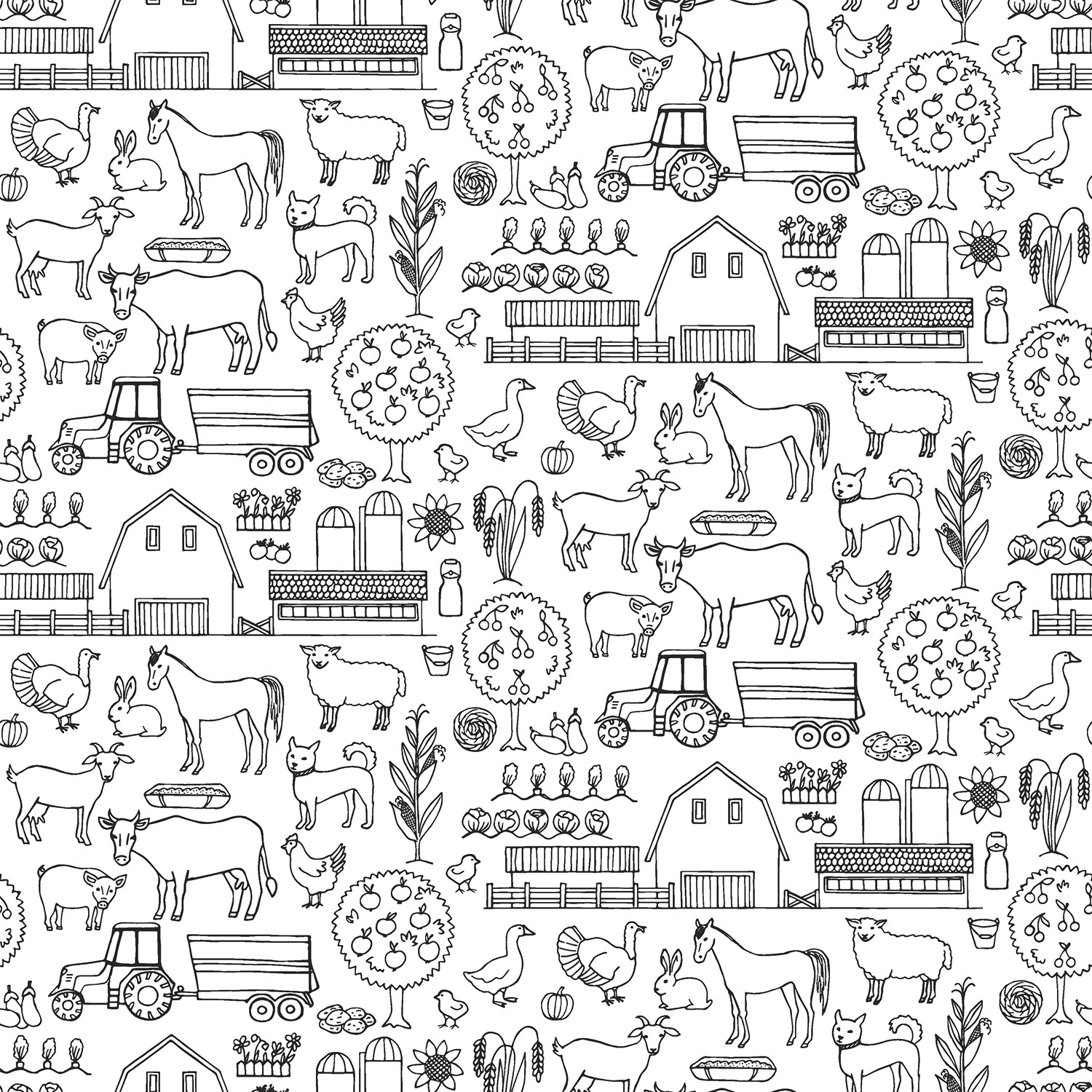 Una granja dibujada con cariño en elegante blanco y negro: esta tela es perfecta para quienes desean combinar líneas claras con motivos juguetones. Sobre el fondo blanco y claro, se despliegan adorables vacas, ovejas, gallinas, tractores, graneros y pequeños detalles de granja que inmediatamente transmiten buen humor.
