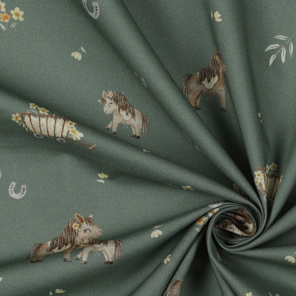 Popelina de algodón - Estampado digital caballos sobre verde salvia