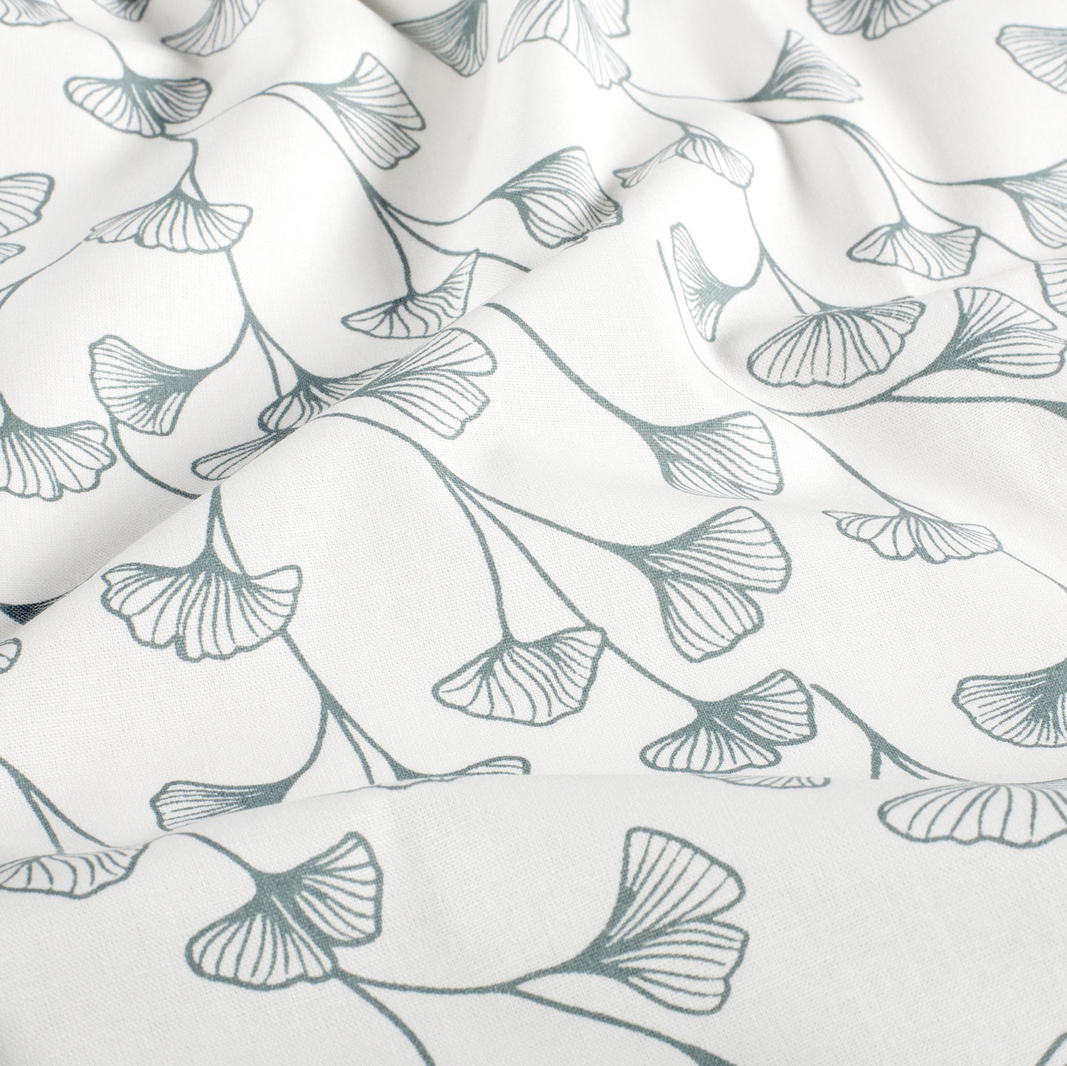 Un delicado mar de hojas para tus ideas de costura: Sobre un fondo blanco brillante se distribuyen finamente dibujadas hojas de ginkgo en un elegante verde oscuro. Los contornos finos y las formas suavemente curvas de las hojas le confieren al diseño una ligereza natural y un toque de elegancia oriental.