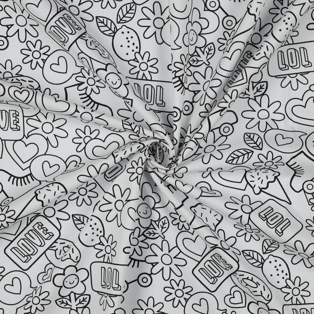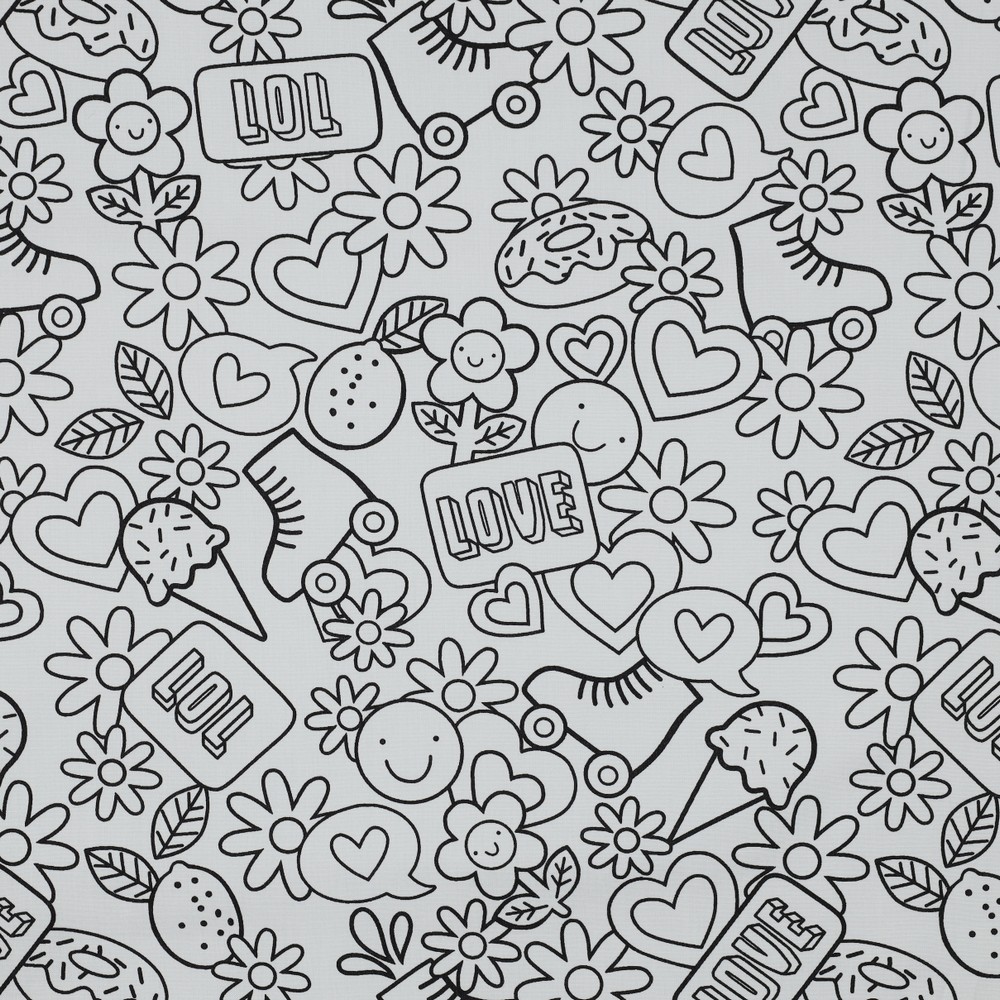 ¡Con esta tela retro para colorear, tu proyecto de tela se convierte en un lienzo creativo! Sobre el fondo blanco se encuentran divertidos y finamente dibujados motivos retro que esperan ser llenados de color por ti.
