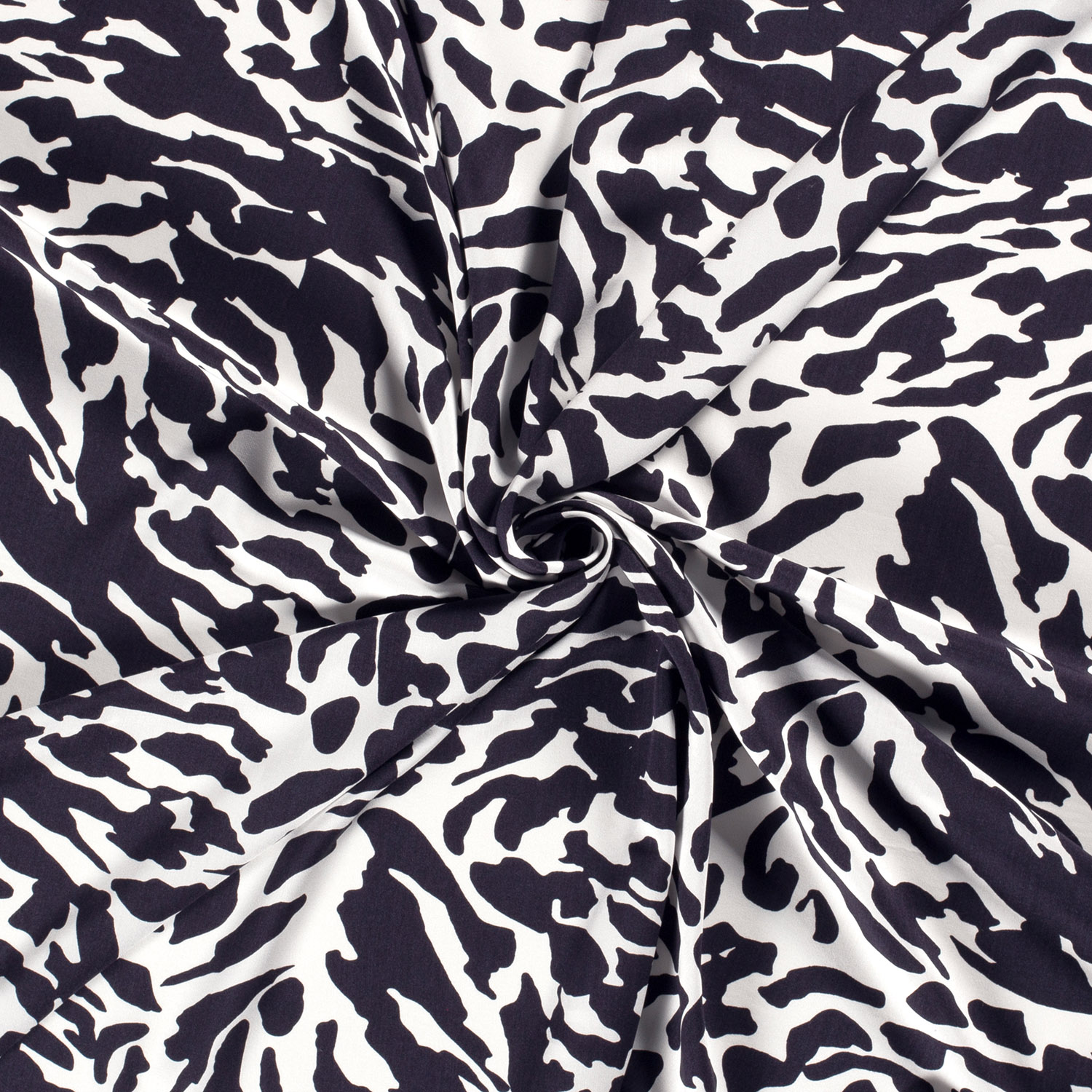 Un look moderno de camuflaje en una paleta de colores elegante: un profundo azul noche se combina con blanco puro y finas tonalidades grises, que forman un estampado vivo pero armonioso sobre la tela. La impresión tiene un estilo urbano y sofisticado en lugar del clásico estilo "militar" – perfecto para quienes aman la tendencia del camuflaje en una versión elegante y apta para el día a día.
