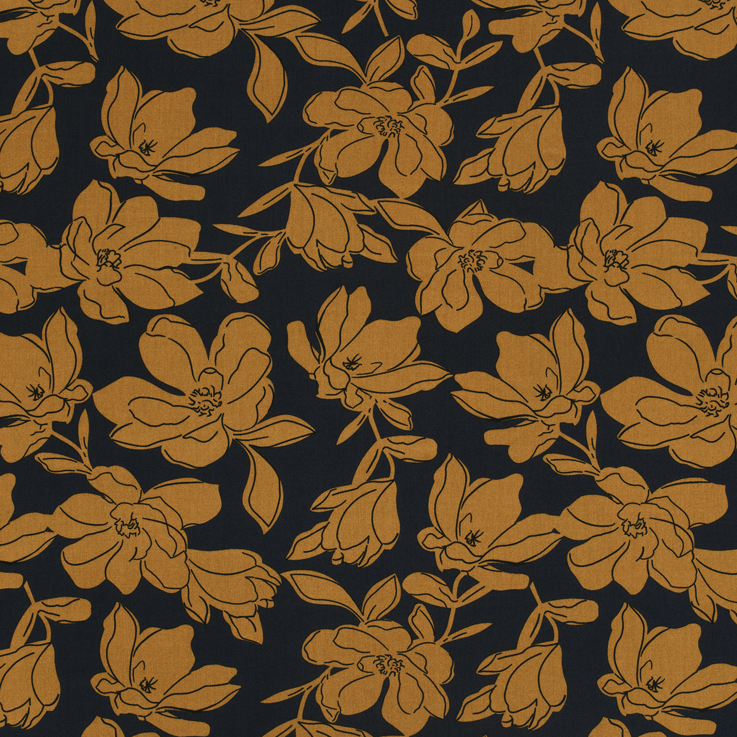 Un sueño floral elegante sobre un profundo navy: Esta tela encanta con un diseño floral fino en tonos suaves de rosa y crema, acentuado por pequeñas hojas y detalles en tonos verdes apagados y tierras. Las flores parecen dibujadas con cariño y se distribuyen armoniosamente sobre el fondo oscuro: femenino, moderno y a la vez atemporal.